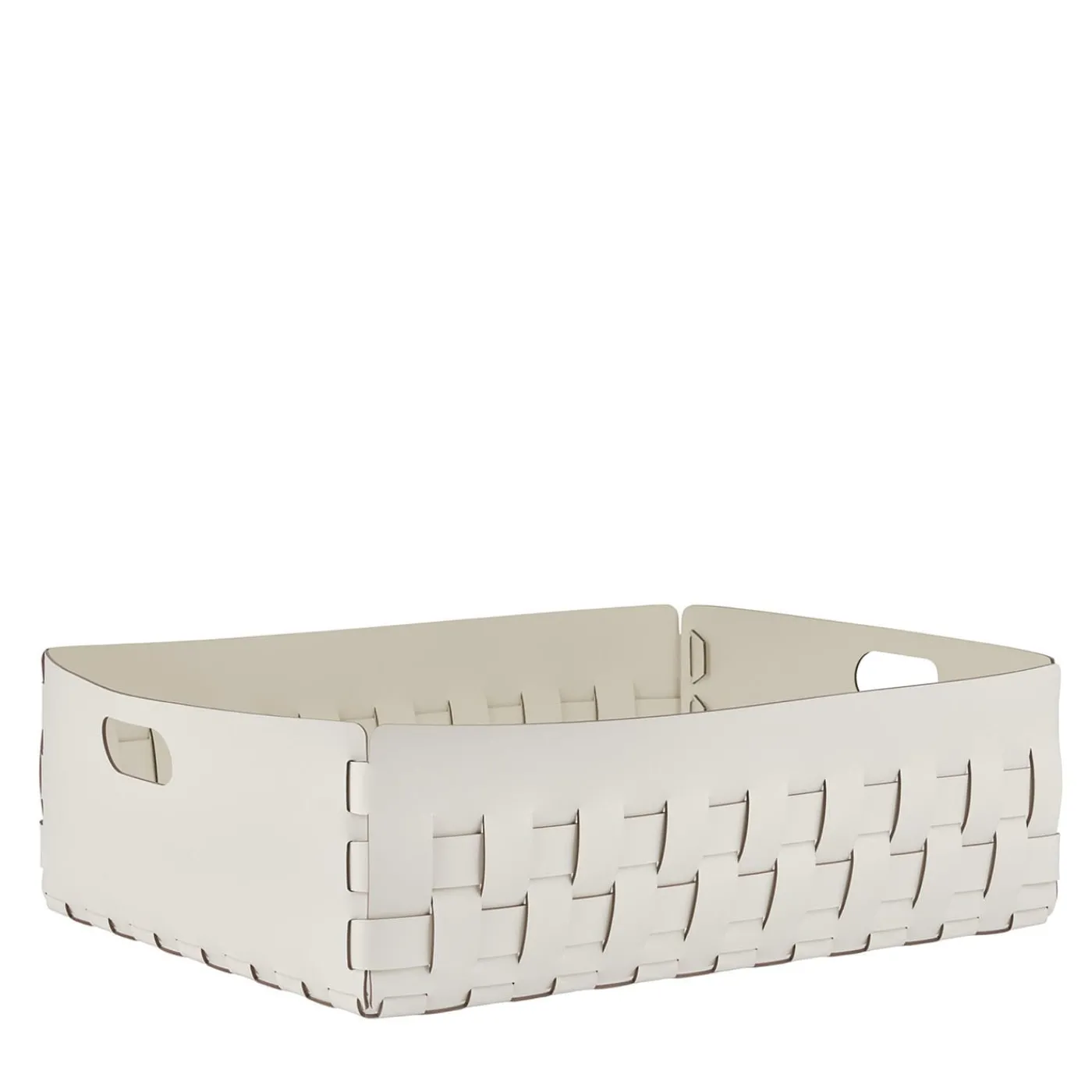 Versatile per diversi ambienti, dai lussuosi yacht alle serene spa e agli eleganti armadi, questo spazioso cestino della designer Ekaterina Borovkova unisce funzionalità ed eleganza. Ideale per organizzare coperte, asciugamani e vestiti di stagione, è caratterizzato da una tonalità Panna Cotta che valorizza qualsiasi ambiente. Realizzato con un intricato intreccio di rettangoli e quadrati, il tessuto garantisce elasticità e flessibilità, mentre la forma rettangolare con bordi bassi e due manici assicura un utilizzo senza sforzo.