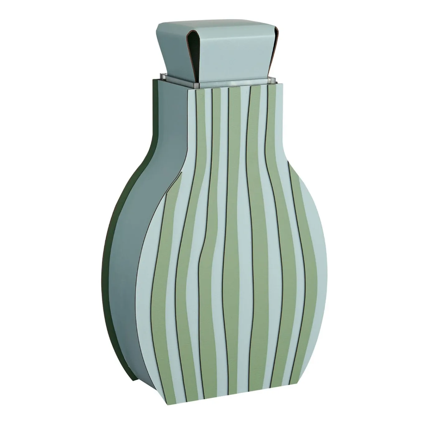 Una creazione unica nel suo genere, pura espressione di illusione ottica, questo squisito vaso catturerà sicuramente lo sguardo. Le strisce verticali di eucalipto sullo sfondo azzurro ne esaltano ulteriormente il fascino visivo, creando un intrigante gioco di profondità e piattezza. Disegnato ad arte da Gianpaolo Venier, questo pezzo trasforma una classica silhouette francese in una meraviglia moderna, con la caratteristica irripetibile di apparire bidimensionale da ogni angolazione.