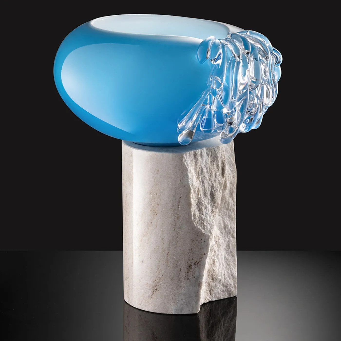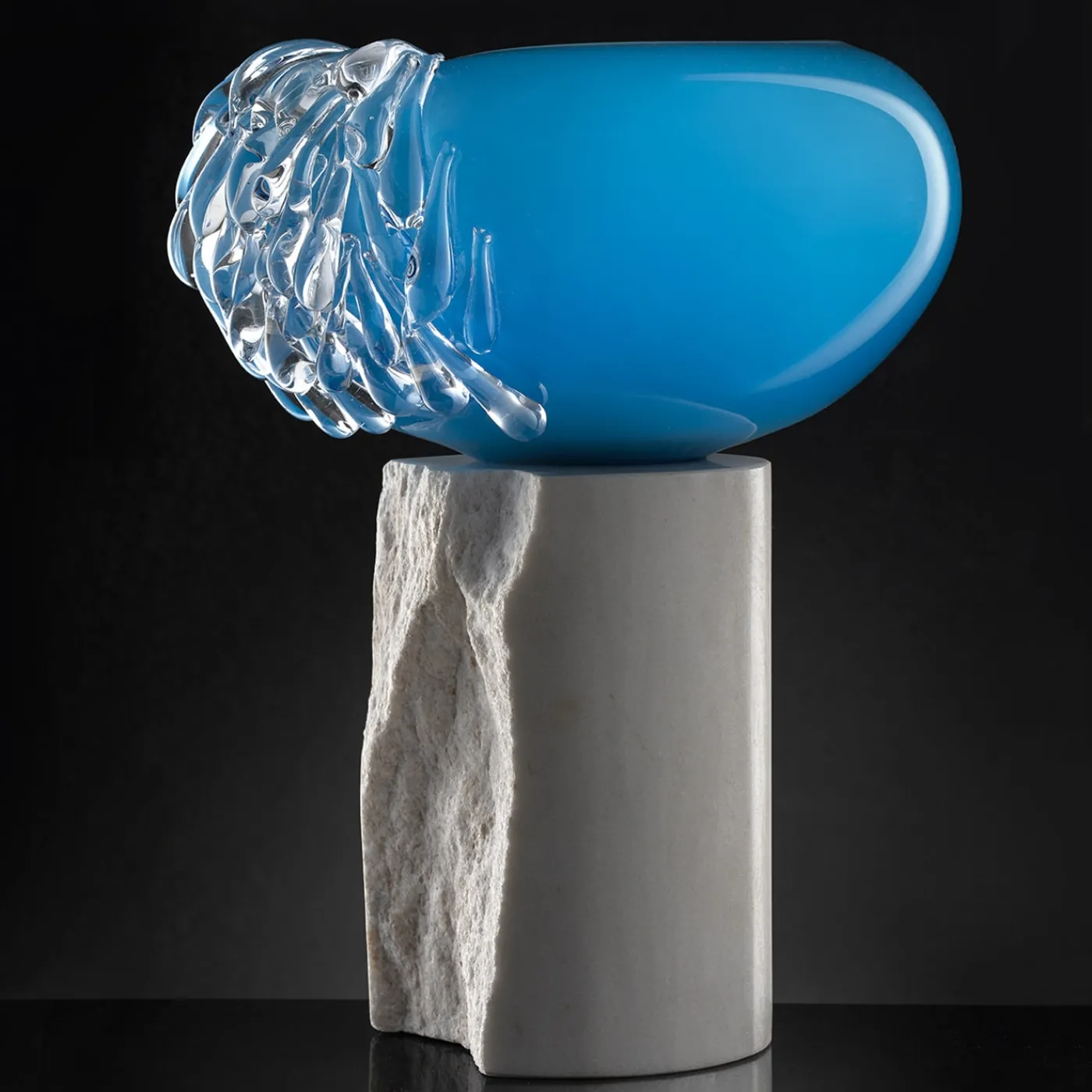 L’oggetto decorativo unisce la maestria dell’arte muranese, un vaso soffiato blu ceruleo, cristallo bianco-latte all’interno e decine di gocce d’acqua in cristallo trasparente unite a un tronco di marmo bianco, dove la parte viva e materica racconta le cime della montagna durante questo maestoso evento tipicamente veneziano chiamato stravedamento.