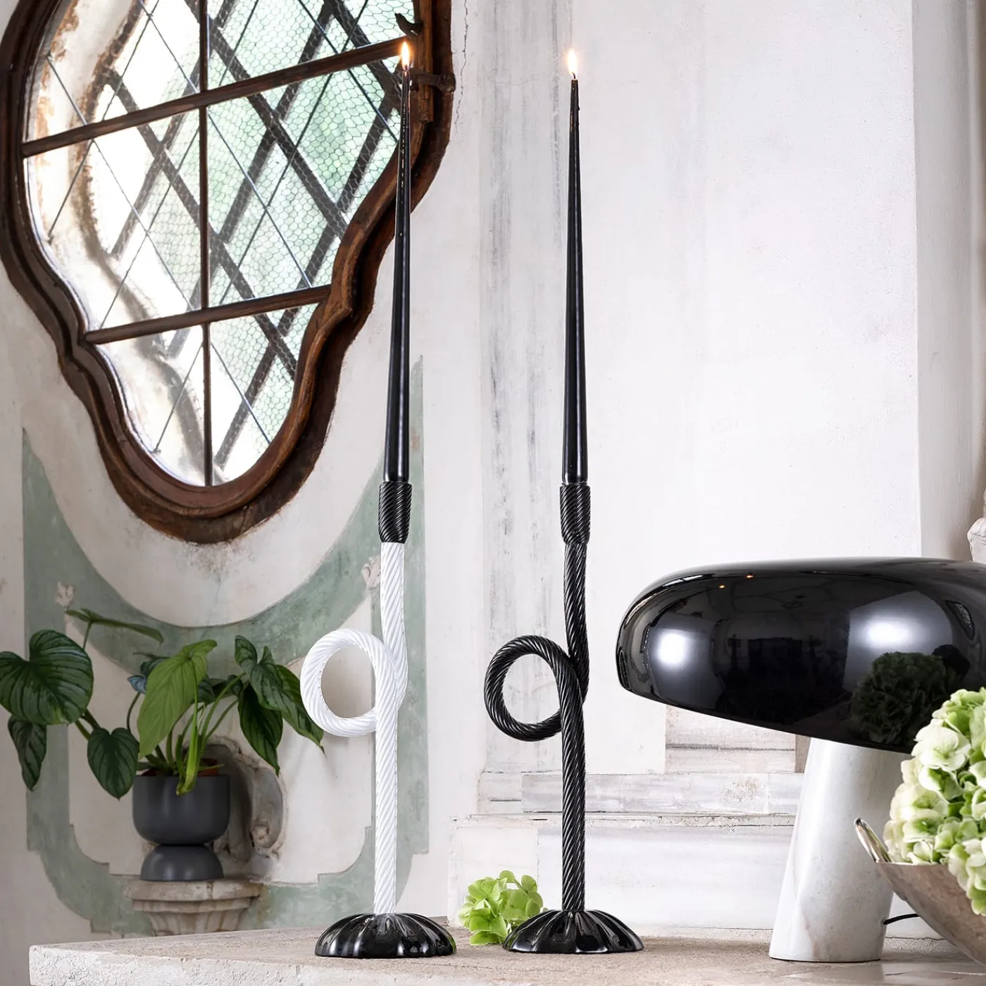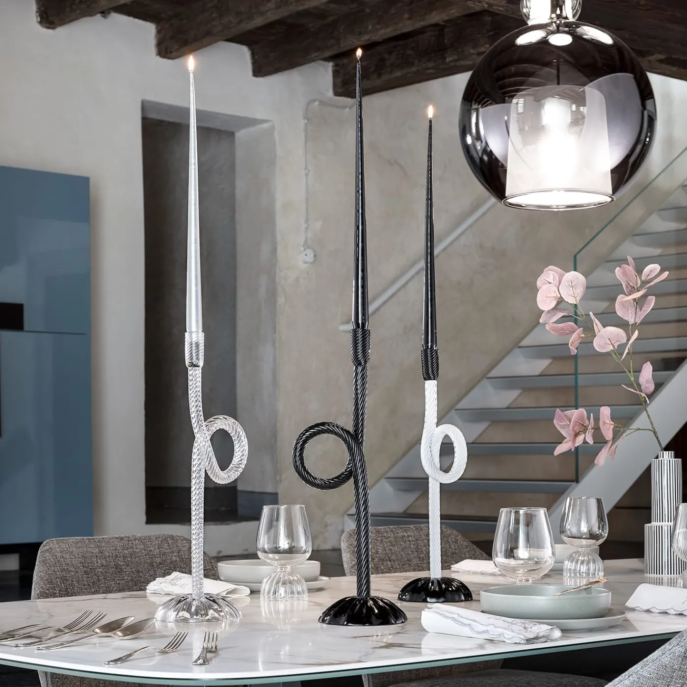 Questo portacandele è un omaggio a Venezia. I nodi e le corde fanno parte della vita quotidiana veneziana. Questa collezione di portacandele, originale e contemporanea, è la dimostrazione fisica di quanto sia complessa la soffiatura e la modellazione del vetro di Murano. Un design eclettico e unico per abbellire la scenografia dell’ambiente abitativo, evidenziando la caratteristica storica della laguna veneziana. La candela non è inclusa.