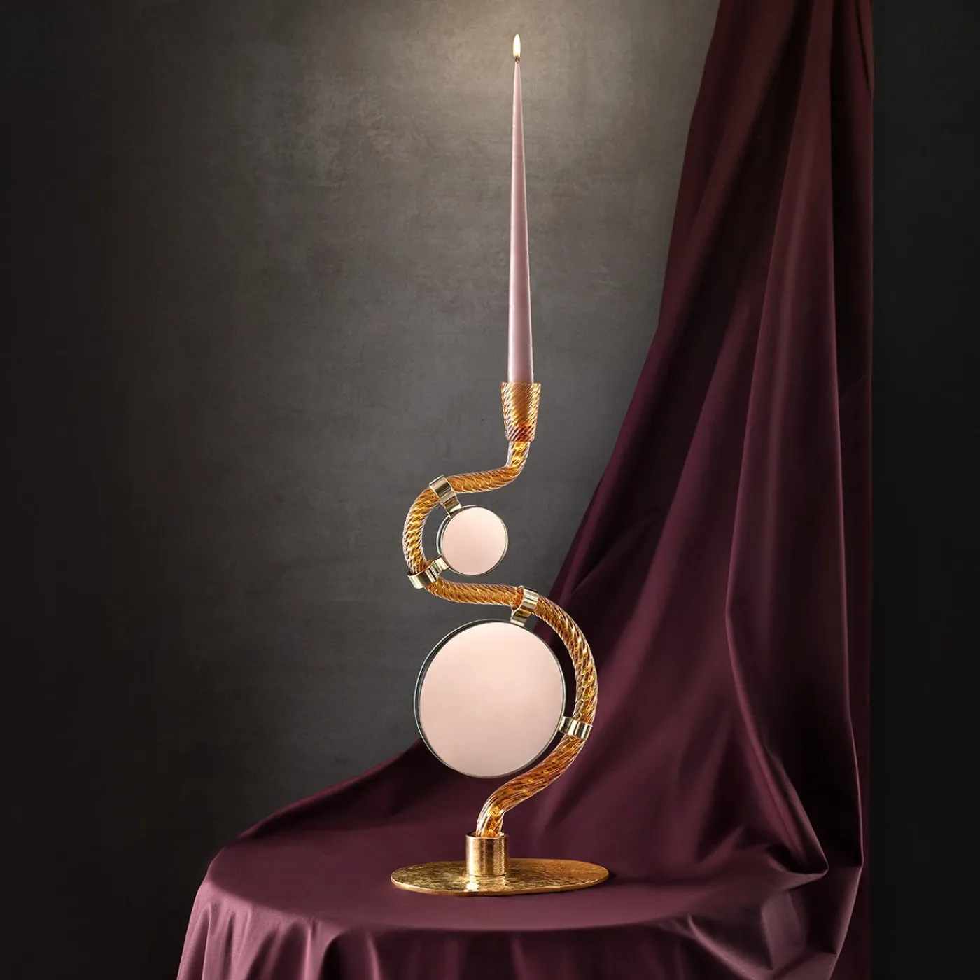 Gli specchi verticali e il candelabro in vetro di Murano oro di questa collezione rappresentano il profondo legame di Aina Kari con il patrimonio veneziano e il design significativo. Il sinuoso vetro dorato soffiato a bocca, con i suoi quattro “ponti” in ottone martellato, evoca la bellezza del Canal Grande e dei suoi iconici ponti. La combinazione di vetro di Murano e specchi colorati di Giovanni Botticelli cattura e rifrange la luce, fondendo la tradizione con l’artigianato moderno. La candela inclusa è bianca. I due specchi sono bifacciali, di colore viola e rosa.