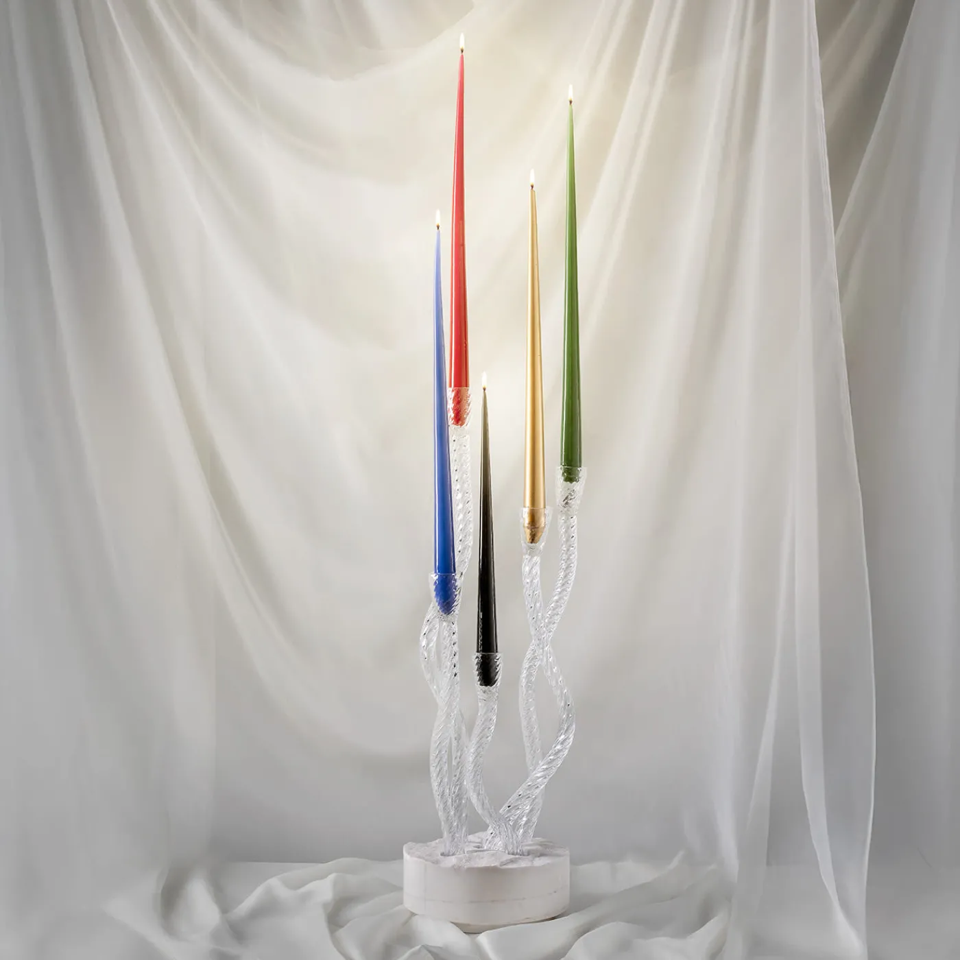 Creata per i collezionisti e gli amanti del design d’eccezione, questa serie unica è stata realizzata per celebrare l’amata festa di Venezia. Redentore è uno splendido candelabro in cui il vetro di Murano e il marmo Palissandro si fondono senza soluzione di continuità in un pezzo unico di arredamento. Questo elegante portacandele scultoreo fonde magnificamente la tradizione con l’artigianato moderno, creando un’unione armoniosa di materiali lussuosi e design senza tempo. Le cinque candele incluse sono bianche.