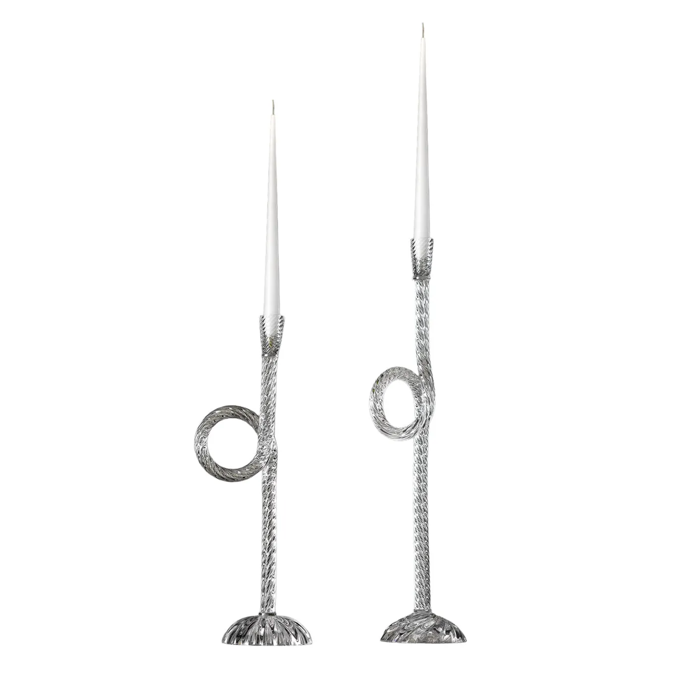 Un set di due candelabri in vetro di Murano, ciascuno caratterizzato da un distintivo design annodato e altezze variabili di 45 cm e 55 cm. Questi pezzi scultorei combinano forme fluide con texture intricate, aggiungendo ritmo ed eleganza a tavole imbandite o a composizioni decorative. La loro costruzione artistica evoca il movimento dinamico del vetro modellato dal fuoco e dal respiro, rendendoli una scelta intenzionale e raffinata per interni sofisticati. Le candele sono incluse.