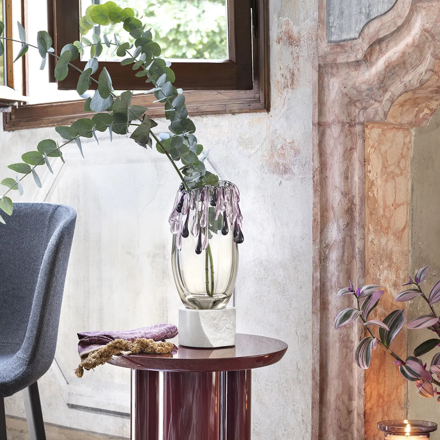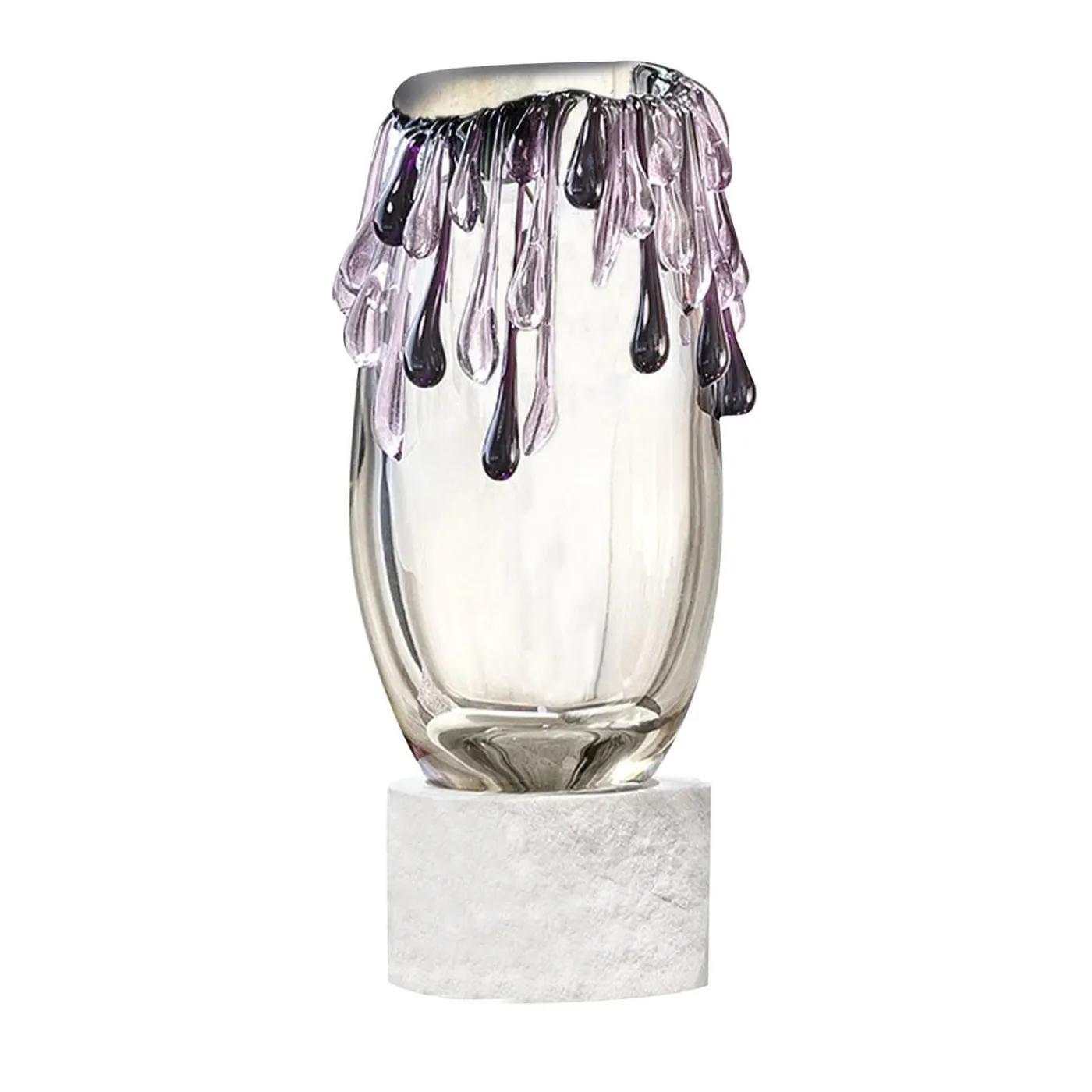 Questo pezzo di design è dedicato a Venezia e alla sua fragilità. La domanda è come Venezia affronterà le sfide dovute al sovraffollamento turistico e al suo impatto sui residenti locali e sulle infrastrutture. Questo vaso artistico è realizzato in vetro di Murano soffiato a bocca e con una base in marmo Palissandro.