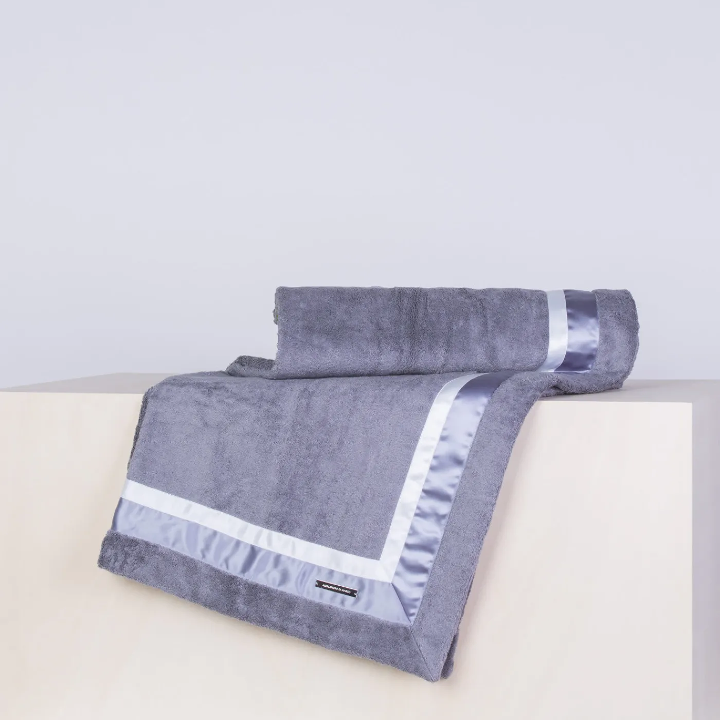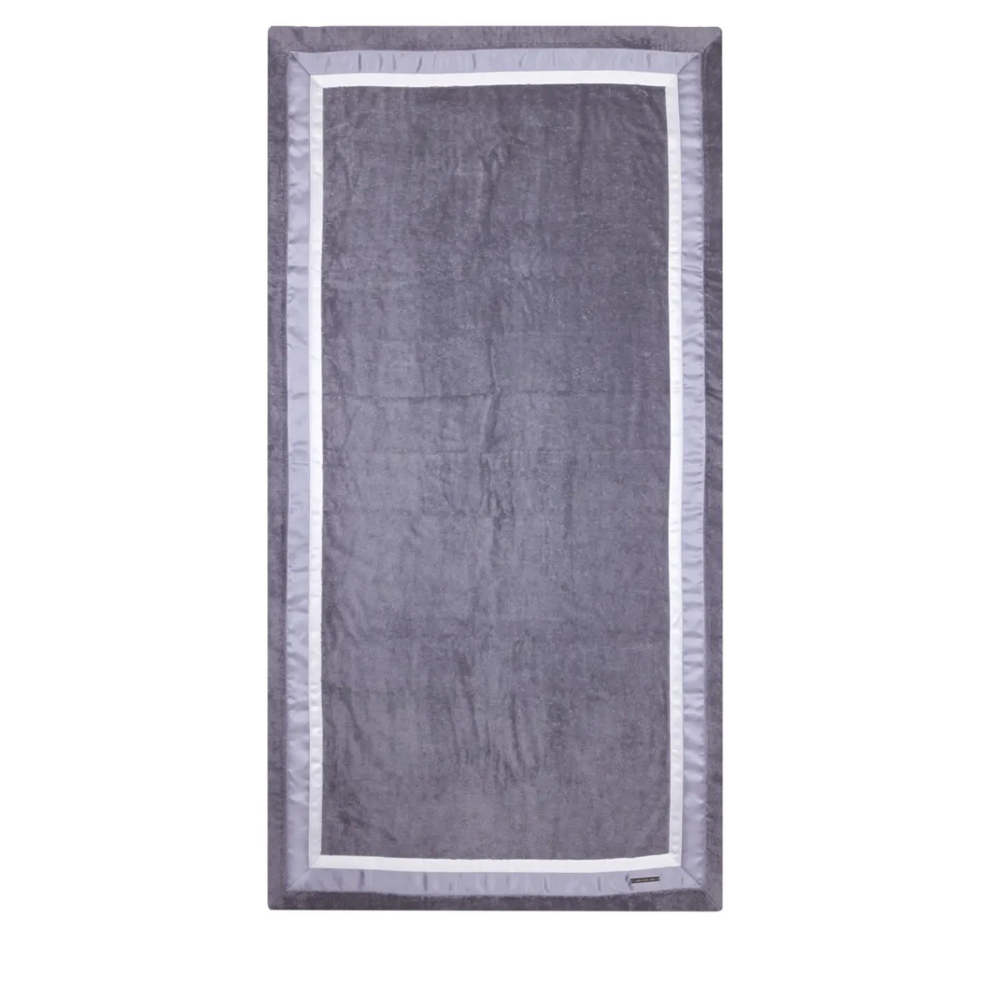Questo elegante telo mare grigio piombo è realizzato in cotone egiziano della migliore qualità, impreziosito da due nastri di raso che ne percorrono il perimetro in grigio e bianco. La targhetta metallica con il logo è in rilievo e presenta una finitura in palladio.