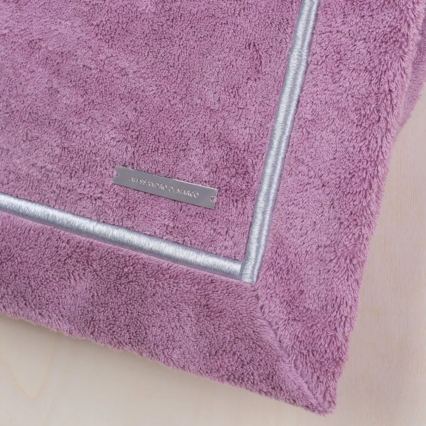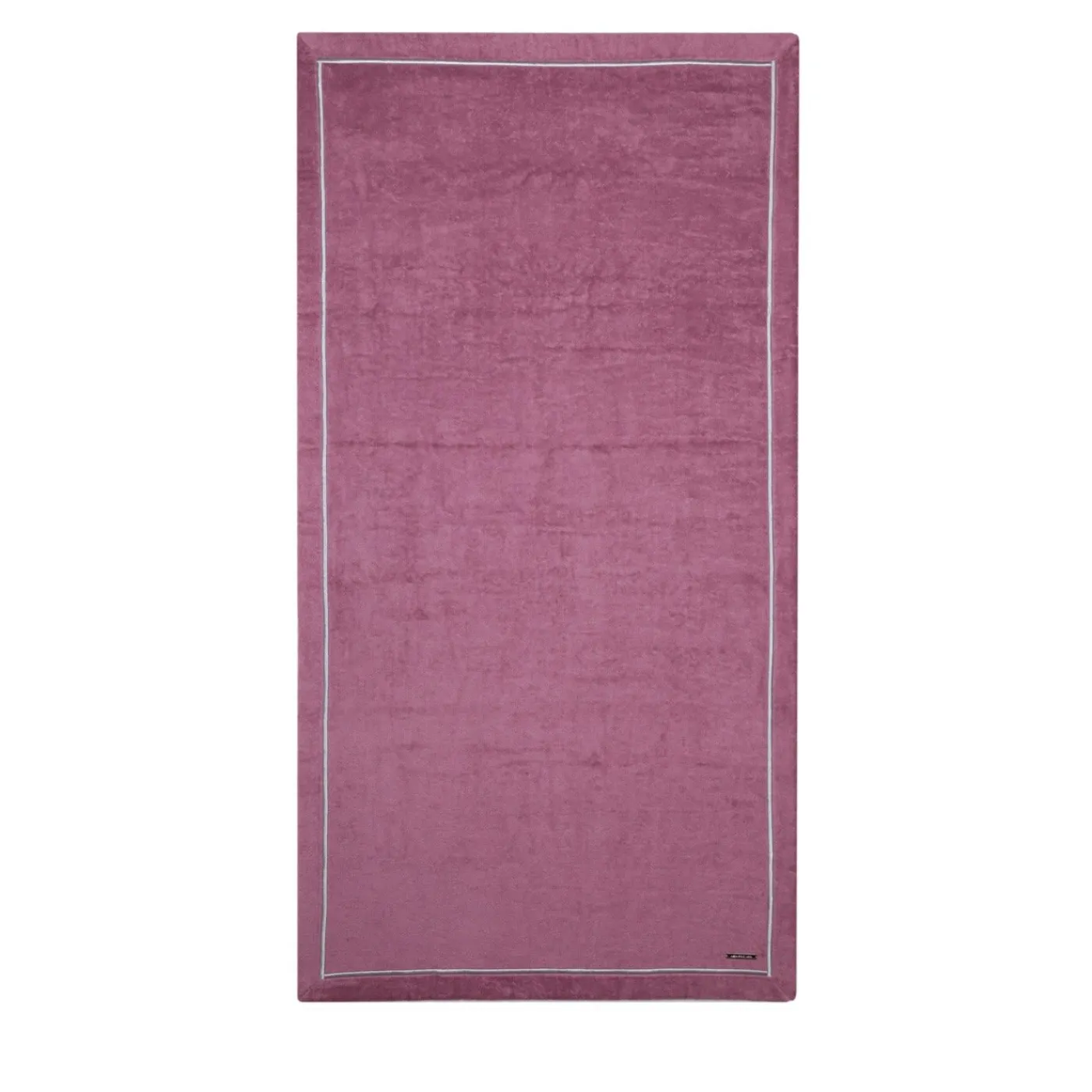 Questo elegante telo mare rosa scuro è realizzato in cotone egiziano della migliore qualità, impreziosito da un nastro argentato ricamato in filo di Lurex che corre lungo il suo perimetro. La targhetta metallica con il logo è stata impressa e presenta una finitura in palladio.