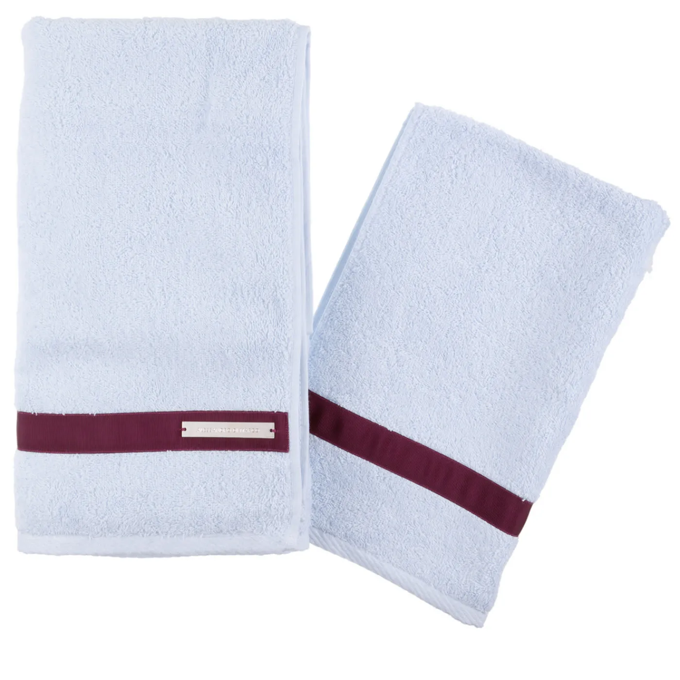 Questo elegante set di asciugamani da bagno è completo di un asciugamano piccolo e di un asciugamano medio di colore blu ghiaccio, in 100% morbido cotone egiziano, impreziosito da un nastro bordeaux. La targhetta metallica con il logo è stata impressa e presenta una finitura in palladio.