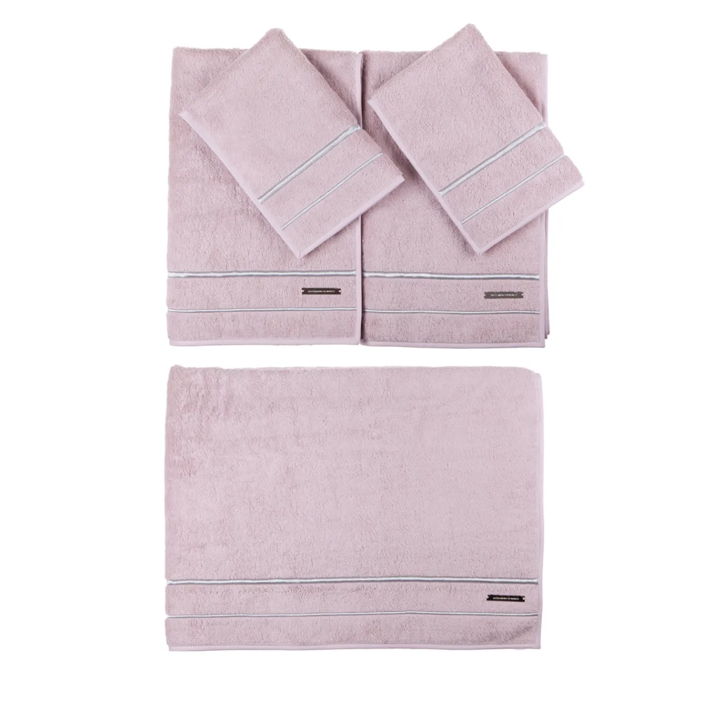 Questo elegante set di asciugamani da bagno è composto da 2 asciugamani di taglia piccola, 2 di taglia media e un asciugamano di taglia grande di colore rosa cipria. 100% morbido cotone egiziano con bordi cuciti a mano, impreziositi da due nastri argentati metallizzati e ricamati con filato Lurex. La targhetta del logo in metallo è stata impressa e presenta una finitura in palladio.