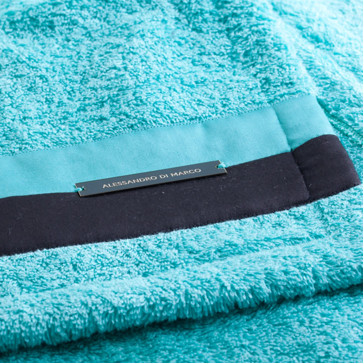 Questo elegante set di asciugamani da bagno è composto da 2 asciugamani piccoli, 2 medi e uno grande di colore verde acqua, realizzati in 100% cotone egiziano della migliore qualità, con bordi cuciti a mano e lussuosamente decorati da nastri di raso neri. La targhetta metallica con il logo è stata impressa e presenta una finitura in oro 18 carati.