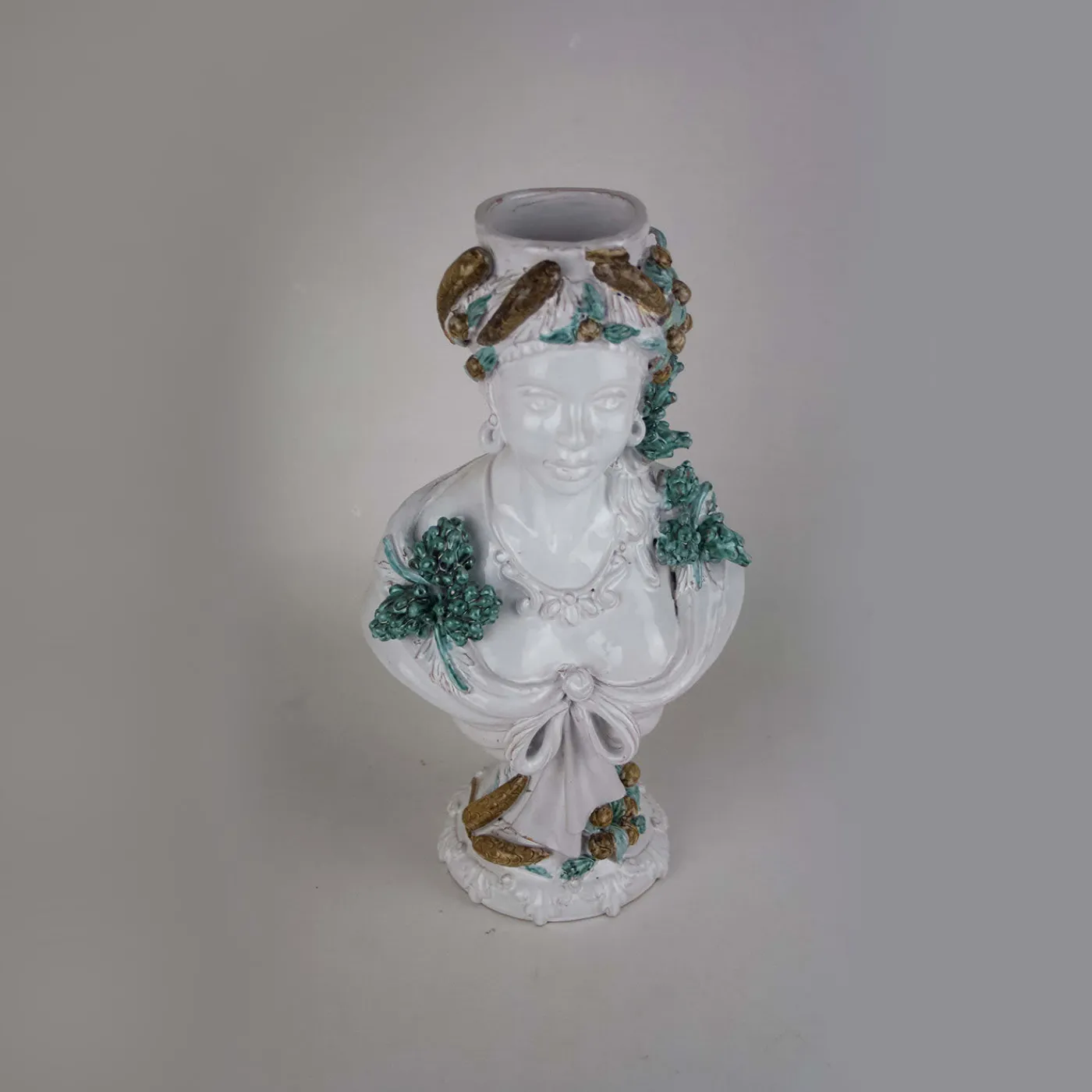 Mettete in mostra la bellezza dell’inverno con questo grazioso busto scultura in ceramica smaltata. Questo busto di donna dai tratti tipici dei Mori che occuparono la Sicilia secoli fa, raffigura il copricapo e le spalle della donna decorati con piante e pigne, con dettagli rifiniti a mano, che richiamano i mesi invernali.