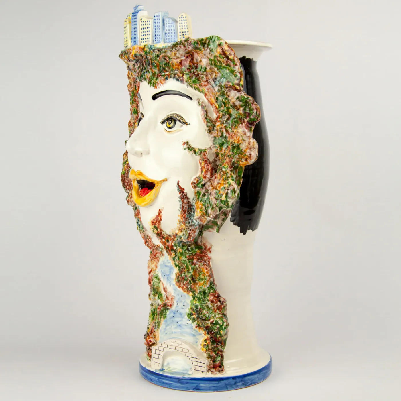 Questo grande vaso da fiori è stato realizzato utilizzando una combinazione di tornio e modellazione a mano dei dettagli. Sul vaso è raffigurato un volto di donna circondato da varie piante. La testa della donna sostiene lo skyline della città di New York.