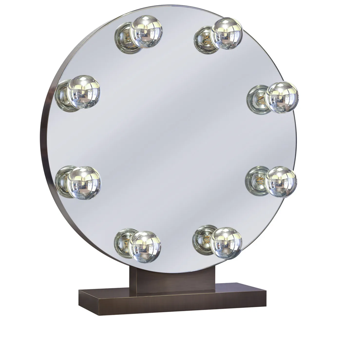 Rivisitazione moderna dell’iconico specchio da trucco hollywoodiano, questo pezzo è realizzato interamente in ottone bronzato con una forma rotonda. La parte frontale presenta uno specchio trasparente con otto sfere lungo il perimetro della cornice che evocano le lampadine dei camerini tradizionali. Questo specchio trasforma qualsiasi camera da letto in uno spazio glamour. La base in ottone bronzato fornisce un supporto stabile a questo pezzo raffinato e moderno che porterà un tocco di Hollywood old-glamour in qualsiasi interno.