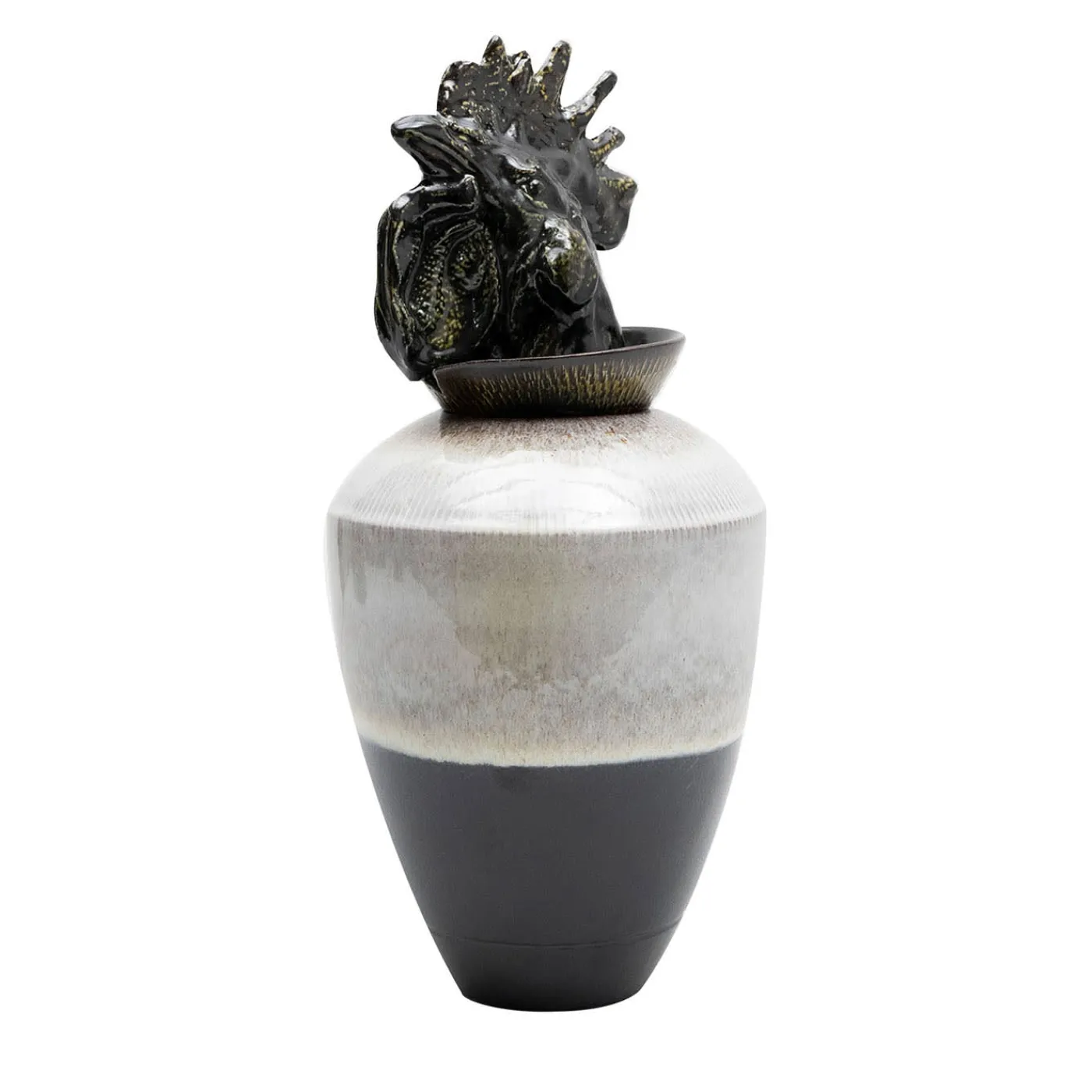 Questo vaso si ispira direttamente ai vasi canopi egiziani; è una reinterpretazione ironica e contemporanea di un oggetto ancestrale, nume tutelare della tranquillità domestica. Creatura dall’aura magica, dotata per lo più di connotazioni positive, il gallo è un animale che porta luce, allegria e traghetta l’uomo fuori dagli incubi della notte. Realizzata a mano e smaltata con ossidi e cristalli, l’opera diventa un oggetto unico, prezioso e scultoreo.