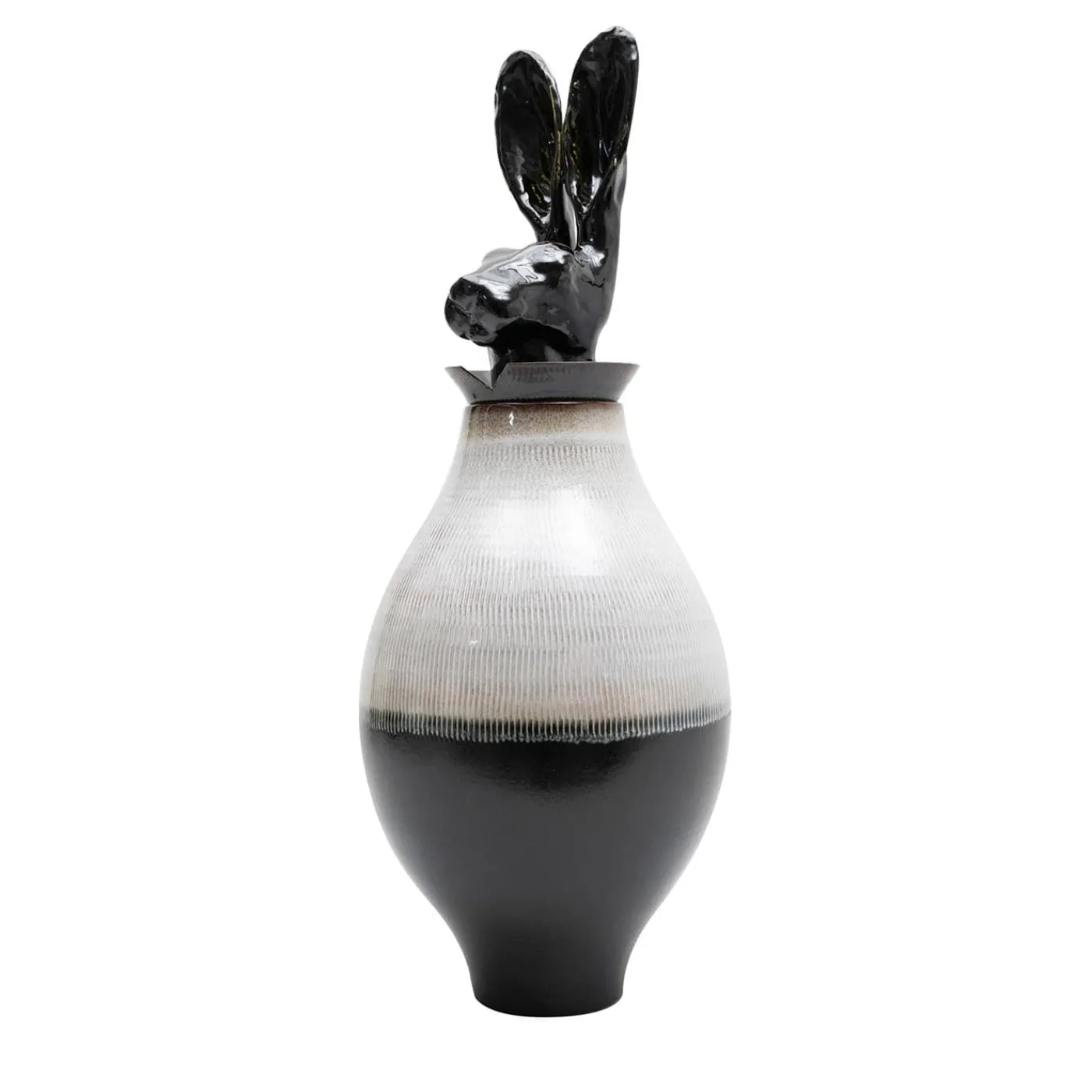 Questo vaso si ispira direttamente ai vasi canopi egizi; è una reinterpretazione ironica e contemporanea di un oggetto ancestrale, nume tutelare della quiete domestica. Il coniglio è infatti un simbolo di abbondanza, prosperità e longevità e più semplicemente un bellissimo animale. Realizzata a mano e smaltata con ossidi e cristalli, l’opera diventa un oggetto prezioso e scultoreo.
