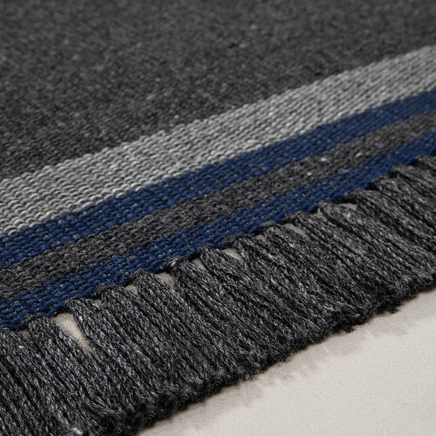 Minimalista ma d’effetto, questo tappeto nero antracite presenta dettagli a strisce blu intenso che spezzano sottilmente l’estetica monocromatica, creando un raffinato contrasto. La struttura a tessitura piatta lo rende resistente e visivamente accattivante, ideale per l’uso in interni e in esterni. Realizzato in PET riciclato al 100%, questo tappeto fonde perfettamente la raffinatezza senza tempo con la responsabilità ambientale, offrendo un pezzo elegante e duraturo. Adatto sia per esterni che per interni.