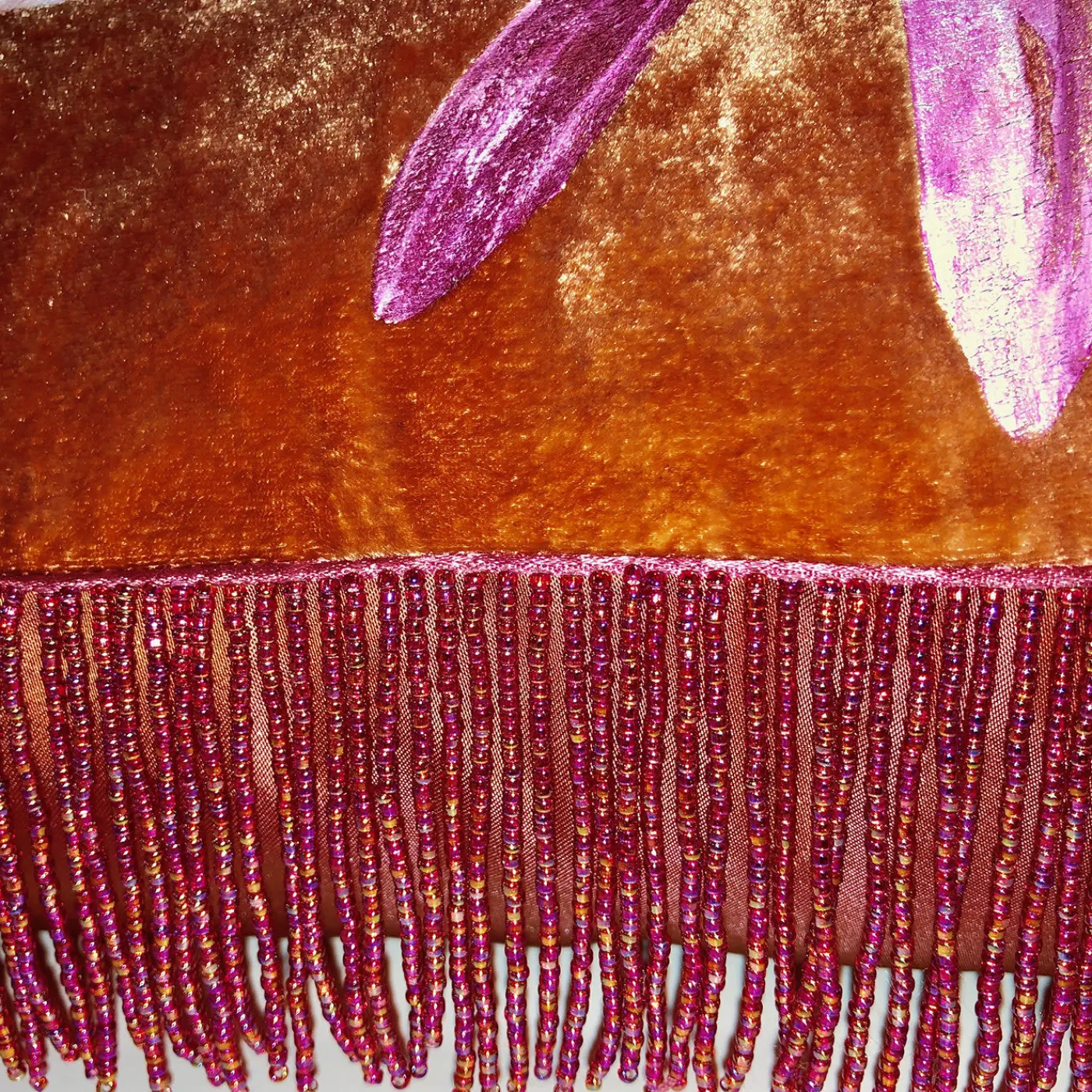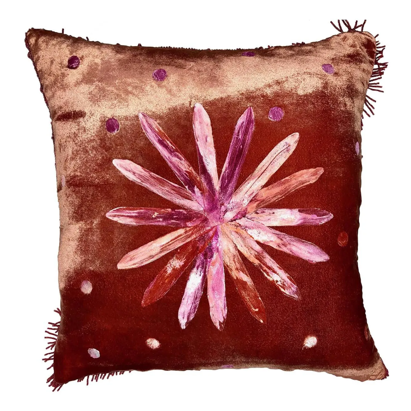 Questo affascinante e artistico cuscino in velluto di seta è tinto con colori rame, rosso e marrone e dipinto a mano con paste colorate. Caratterizzato da un dorso in seta color rame, è circondato da una splendida guarnizione di perline di vetro. Il disegno è uno spettacolare fiore in stile margherita che donerà un aspetto delizioso e divertente a qualsiasi stanza.