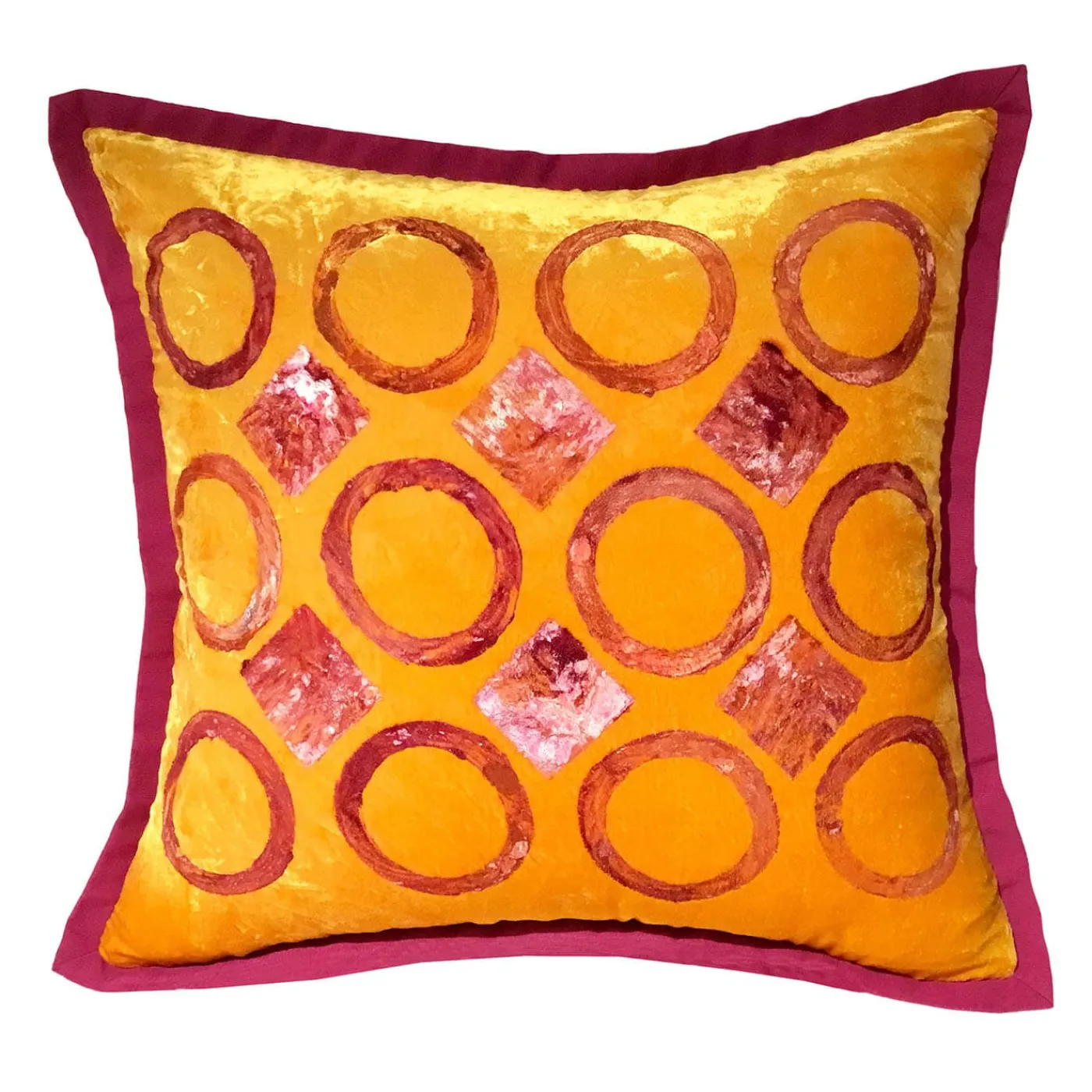Scoprite la maestria di questi cuscini in velluto di seta, dove il ricco patrimonio della tappezzeria veneziana incontra la sensibilità del design moderno. Ogni cuscino è meticolosamente realizzato a mano, con pigmenti naturali utilizzati per creare colori intensi e vibranti. Questo cuscino presenta un sorprendente motivo geometrico di cerchi rosa e rossi su una calda tela arancione, che mette in risalto la sontuosa texture del velluto. Un’aggiunta davvero accattivante a qualsiasi spazio.