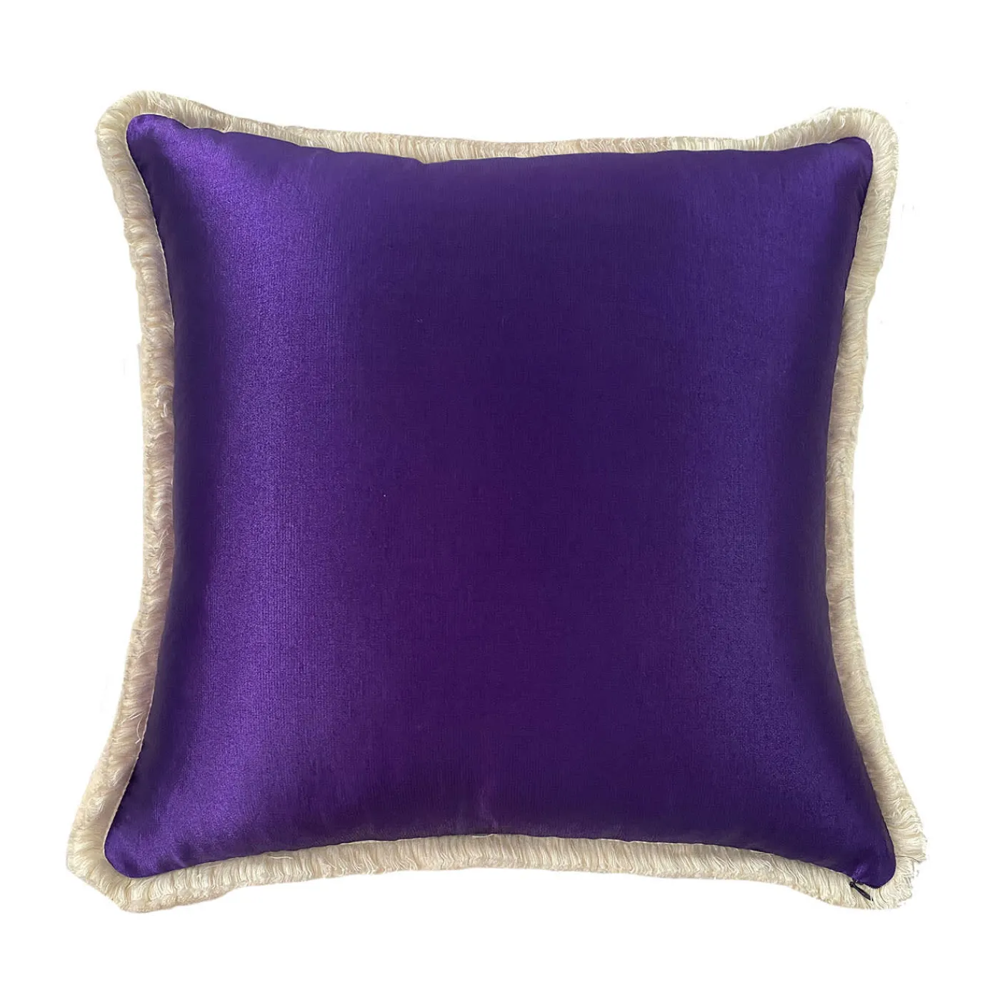 Questo cuscino in velluto di seta è un’esplosione di colori e texture. Il cremisi profondo è stato creato utilizzando pigmenti naturali, che richiamano l’arte degli arazzi veneziani tradizionali. Il design del cuscino presenta piccoli triangoli dipinti che aggiungono un tocco vibrante alla superficie iridescente. Il retro è realizzato in seta viola iridescente a contrasto, creando un equilibrio visivo armonioso. Una frangia scintillante aggiunge un tocco finale di opulenza.