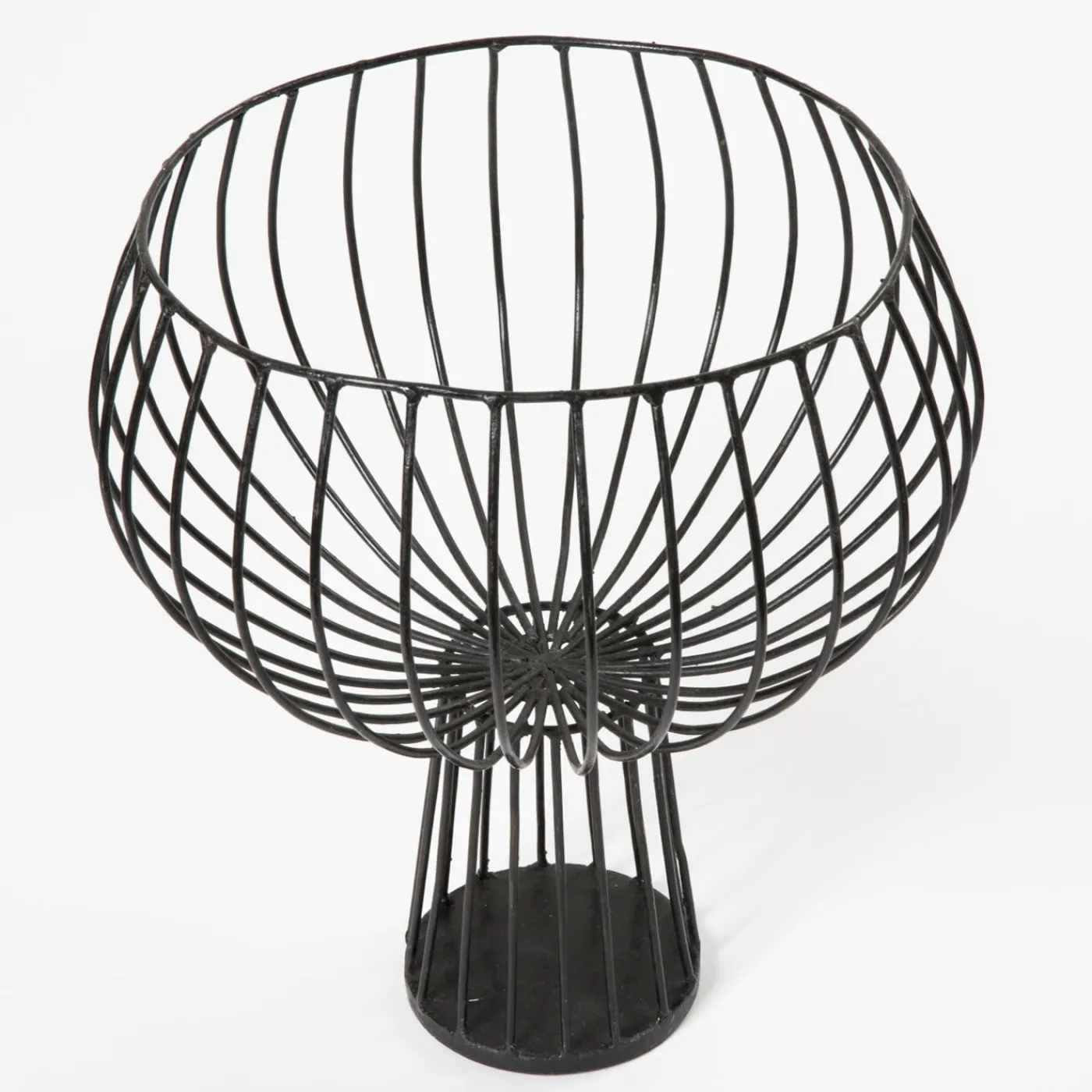 Elegante vaso nero a forma di cupola in filo di ferro zincato, sollevato da un cilindro dello stesso materiale, con linee di ferro a raggiera che sporgono dal bordo e si piegano sui lati. Si consiglia una manutenzione occasionale mediante lucidatura con cera per mobili in legno.