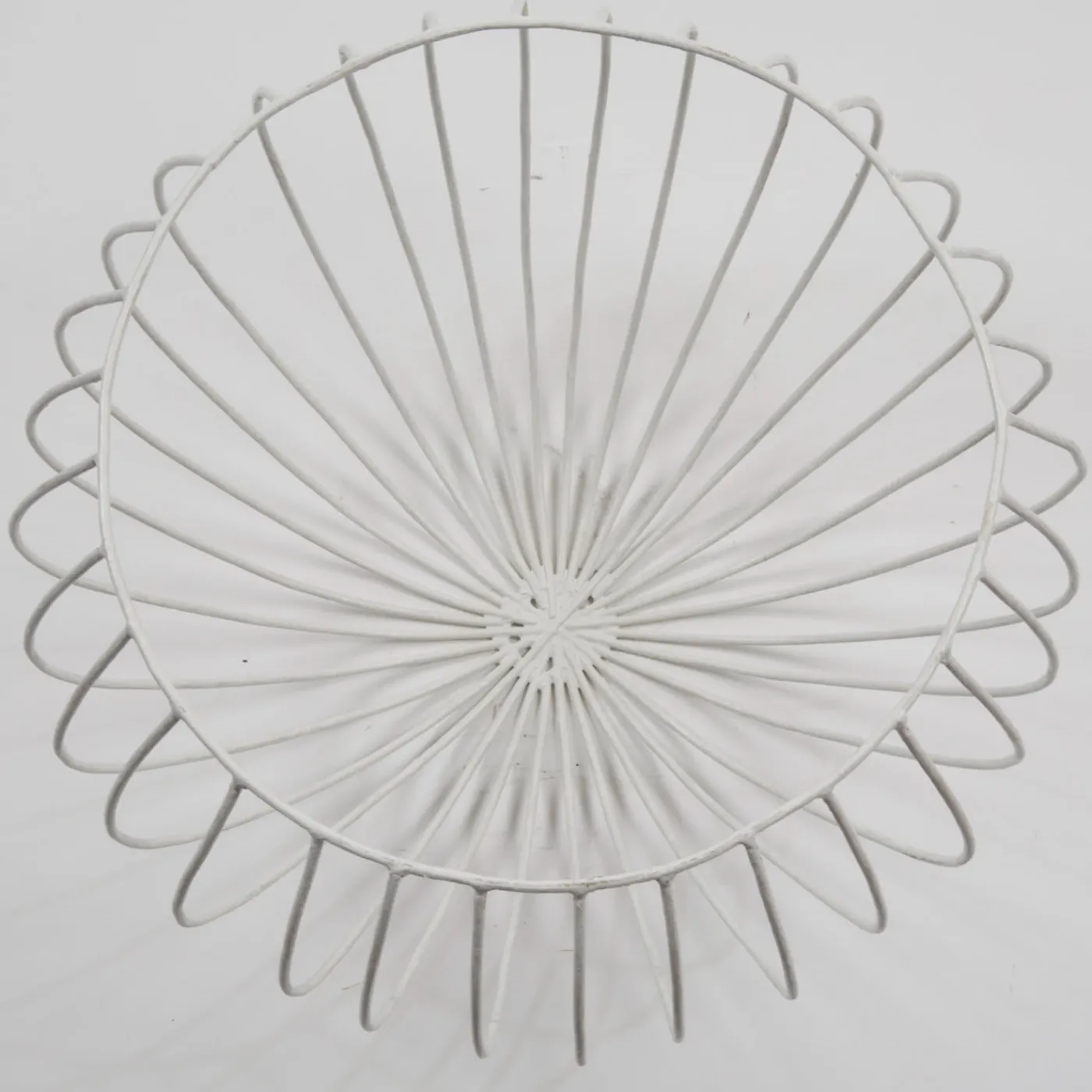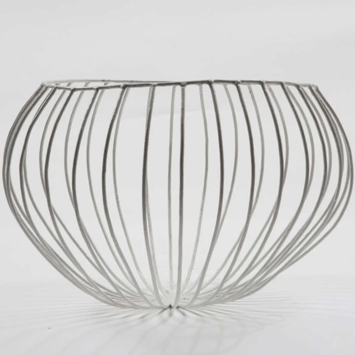 Gustoso vaso bianco a forma di cupola di Sciortino. Il pezzo è realizzato in filo di ferro zincato, con barre di ferro a raggiera che sporgono sul bordo e si piegano sui lati, creando così linee morbide che ricordano i passi di danza. Per i mobili in legno si consiglia una manutenzione occasionale con lucidatura a cera.
