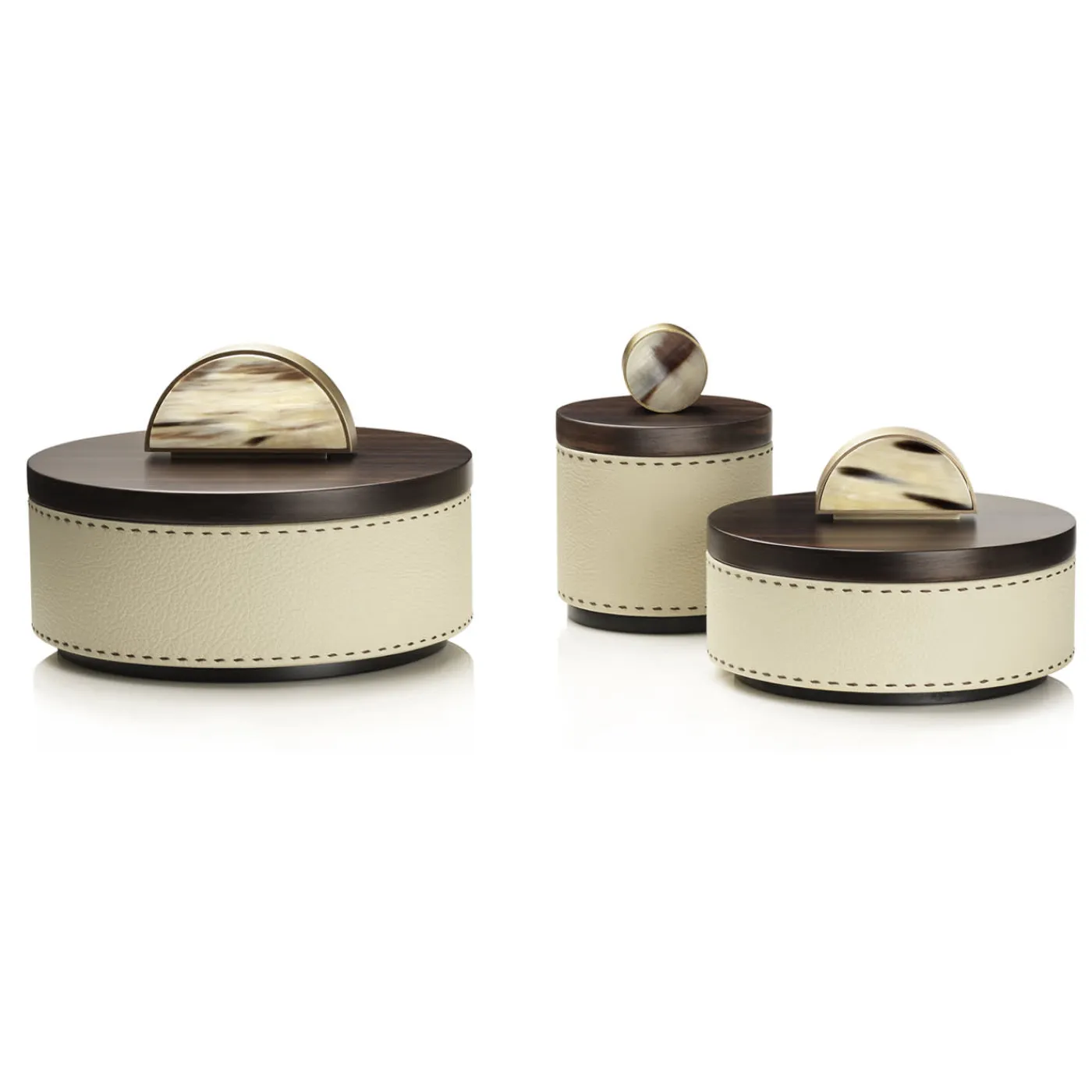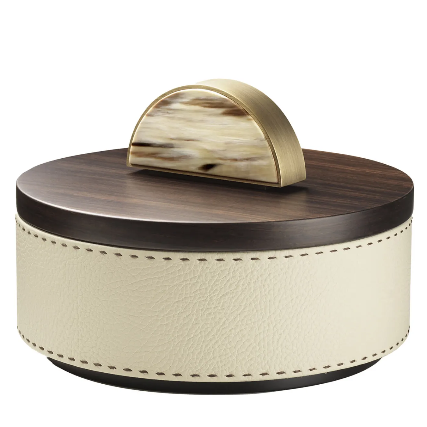 Scatola tonda in pelle Aida, color gelato, con cuciture fatte a mano in marrone scuro. Coperchio impiallacciato in ebano Amara opaco con maniglia a mezzaluna in corno e ottone brunito. Per ulteriori informazioni, contattare il Concierge.