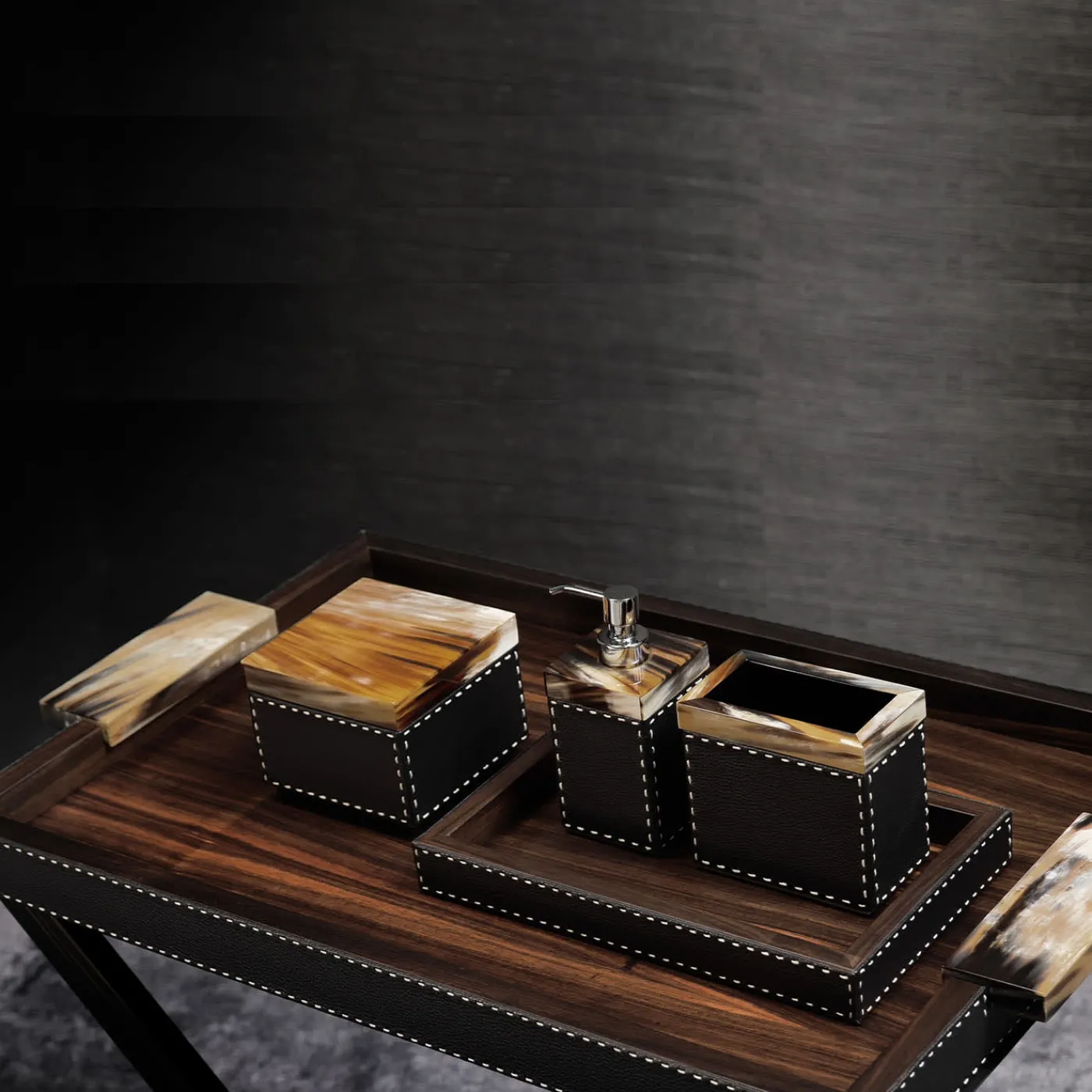 Un piccolo design che emana opulenza e carattere, questa scatola dal taglio quadrato permette di raccogliere e conservare con stile piccoli oggetti come gli anelli preferiti. Il caratteristico coperchio in corno con finitura lucida poggia su un corpo raffinato, impiallacciato internamente in ebano Amara opaco e rivestito esternamente in pelle Aida nera con ciottoli. Cuciture avorio cucite a mano sigillano il pezzo.