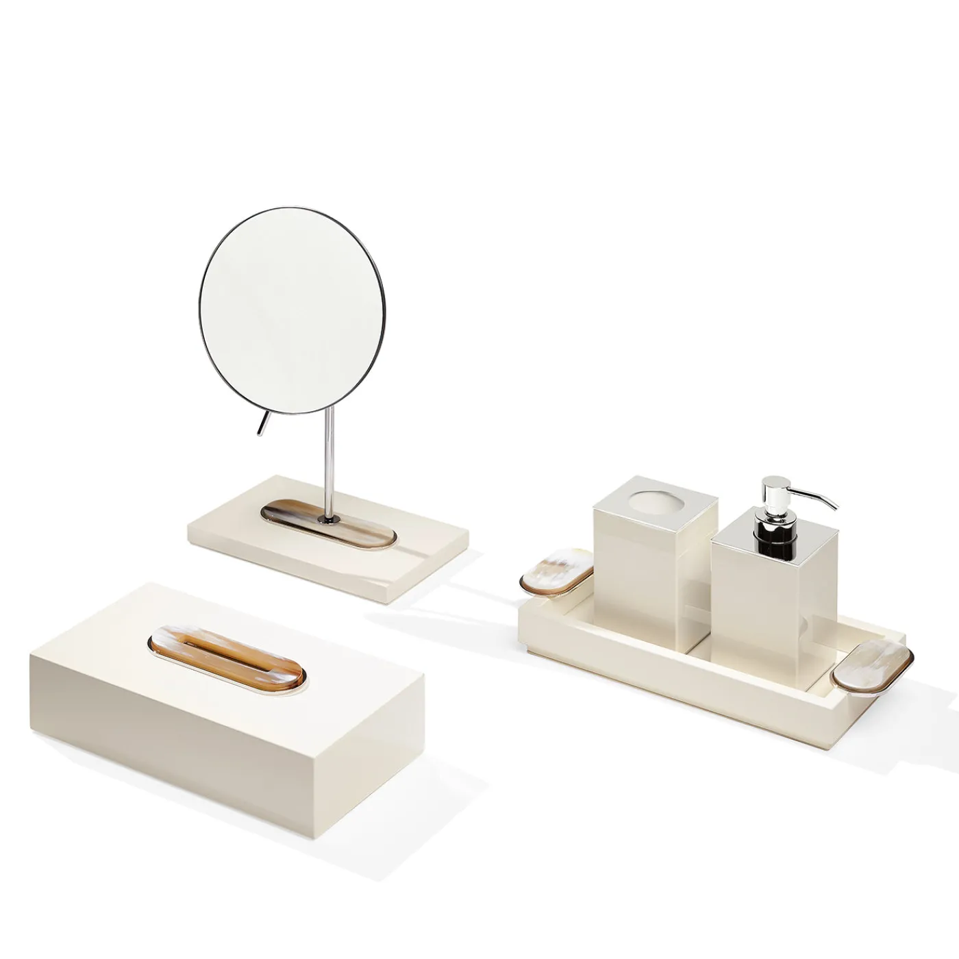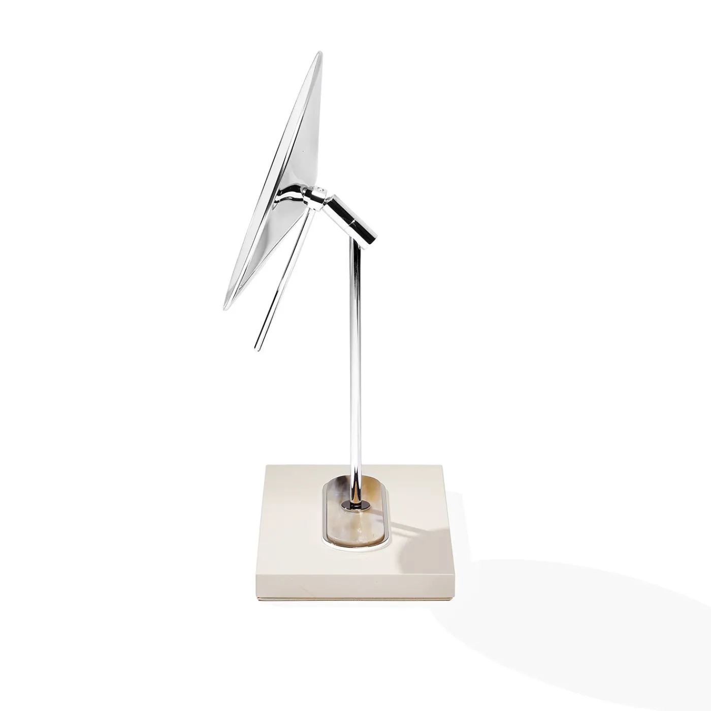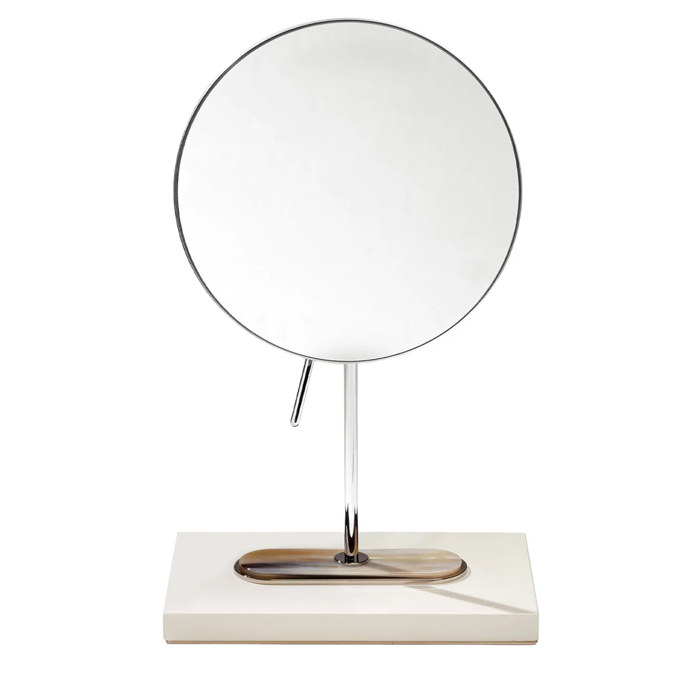 Specchio da trucco ingranditore con lente rotonda incorniciata da un telaio in ottone cromato. La base, in legno laccato color avorio, è arricchita da preziosi dettagli in corno e inserti in ottone cromato, creando un raffinato equilibrio di materiali. Progettato per l’uso da tavolo, unisce praticità e ricercatezza, offrendo un supporto elegante per il make-up e la cura personale.