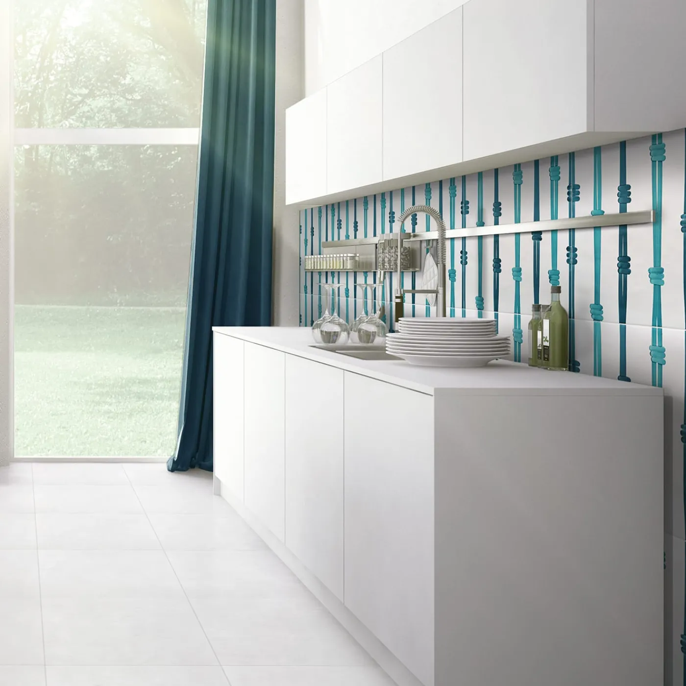 La creazione di un’elegante atmosfera di ispirazione orientale troverà la sua soluzione ideale nell’esposizione di un set di piastrelle quadrate in ceramica, che sfoggiano una superficie leggermente strutturata ed elementi simili a canne di bambù abilmente dipinti a mano. Il suo motivo stilizzato è ottenuto combinando sapientemente pennellate sicure in diverse tonalità di verde acqua che emergono fresche dal fondo bianco. Ha una classificazione PEI di 5.