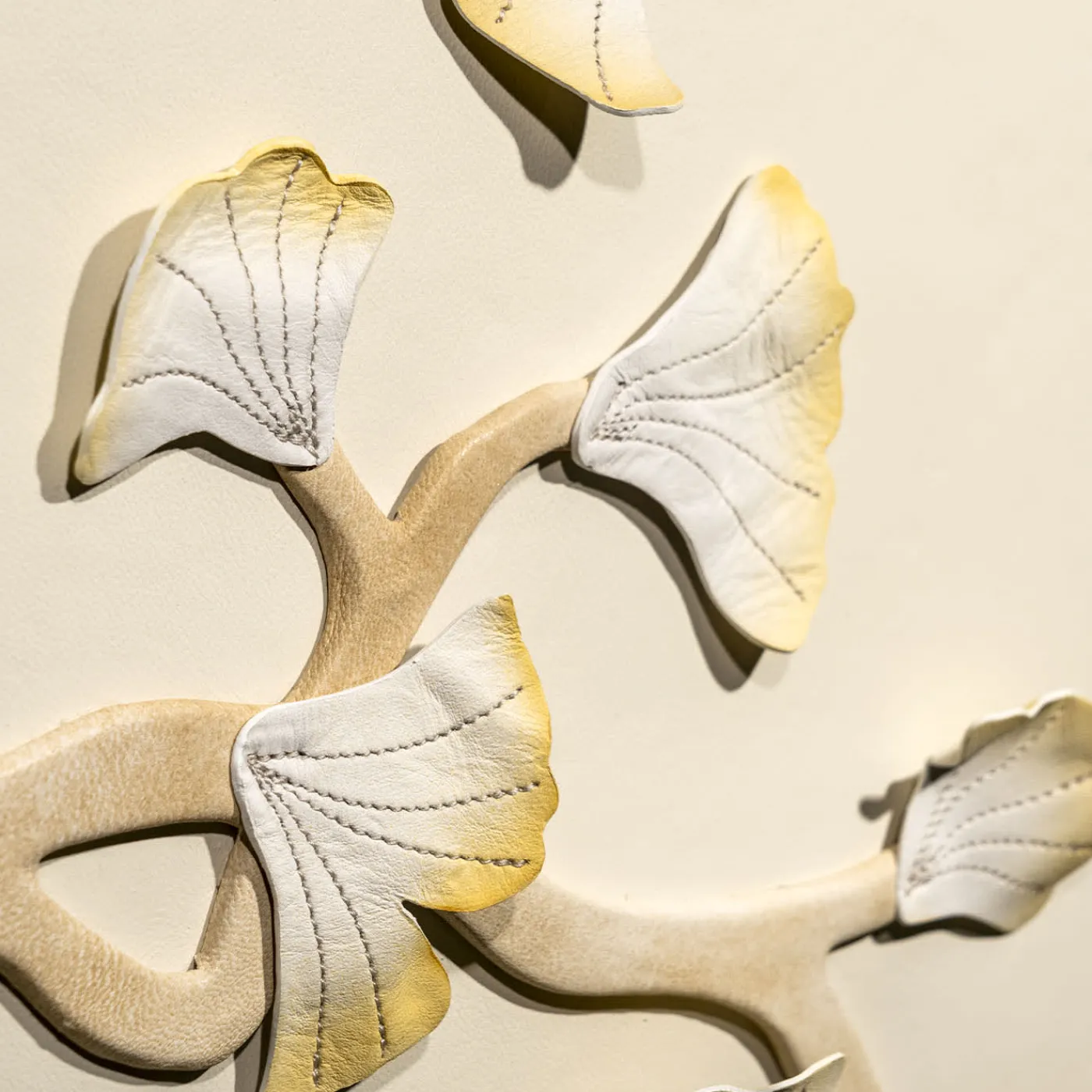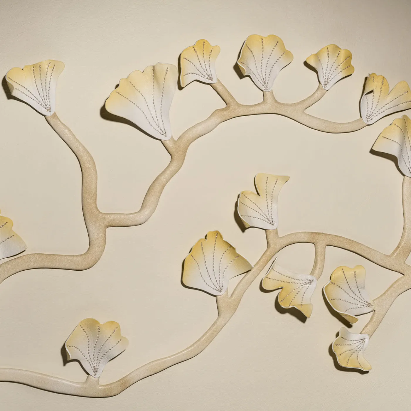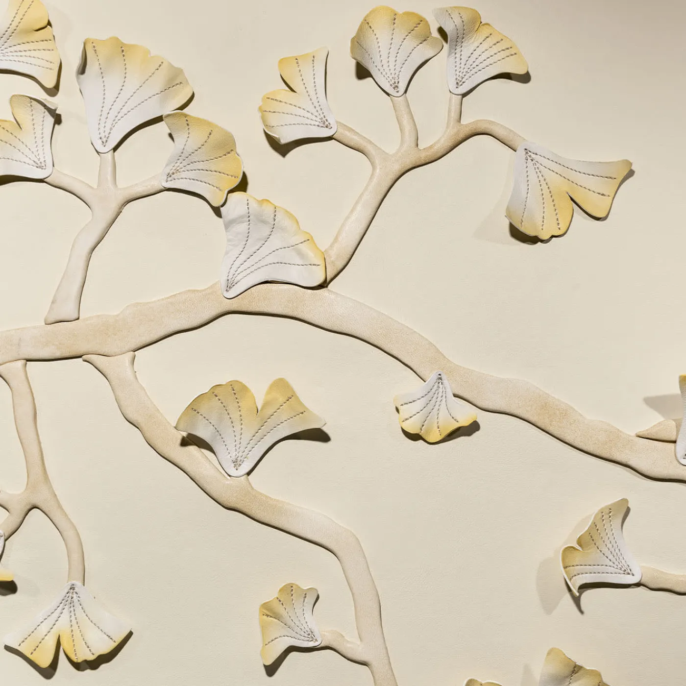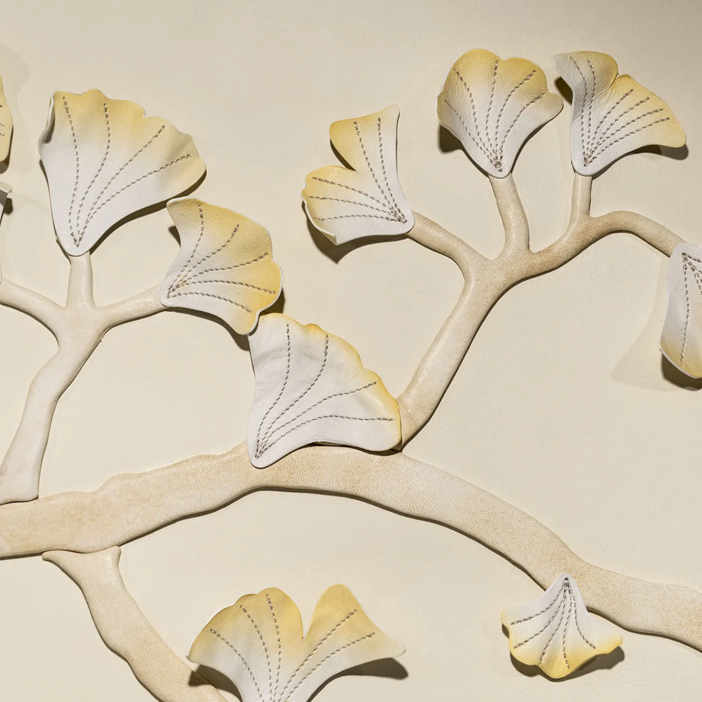 Questo pannello mette in mostra l’eccellenza artigianale attraverso un disegno botanico in pelle bovina di prima qualità. Raffigurante un ramo di ginkgo, simbolo di resilienza, utilizza una tecnica di bassorilievo piegata a mano per creare una scultura tridimensionale. La morbida pelle di pecora forma i rami, mentre ogni foglia è meticolosamente cucita per aumentare il realismo. Lo sfondo in pelle liscia mette in risalto la composizione, con una tavolozza monocromatica ispirata ai fregi marmorei classici, che aggiunge eleganza e dinamismo senza tempo.