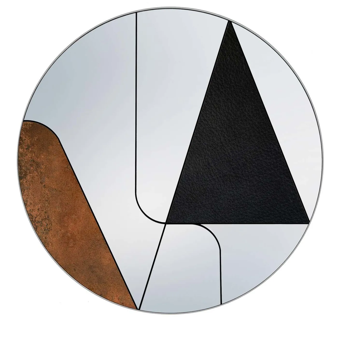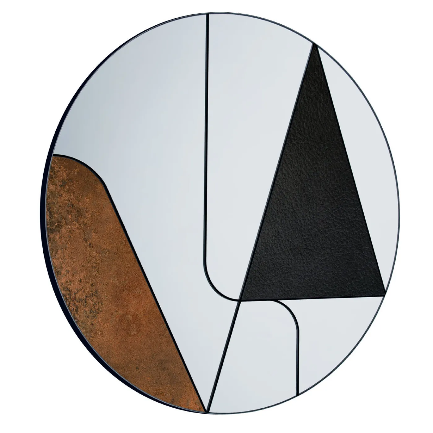 Audace e sofisticato, questo specchio si farà notare in un interno contemporaneo o industriale, grazie al suo superbo gioco di colori e linee. Una base in legno sostiene la sua silhouette rotonda composta da una serie di elementi a specchio montati su una struttura in acciaio. L’aggiunta di un pezzo ritagliato in acciaio corten e di un triangolo in pelle nera aggiunge un tocco unico e un elemento decorativo dinamico a questo superbo oggetto di arredamento funzionale, interamente realizzato a mano.