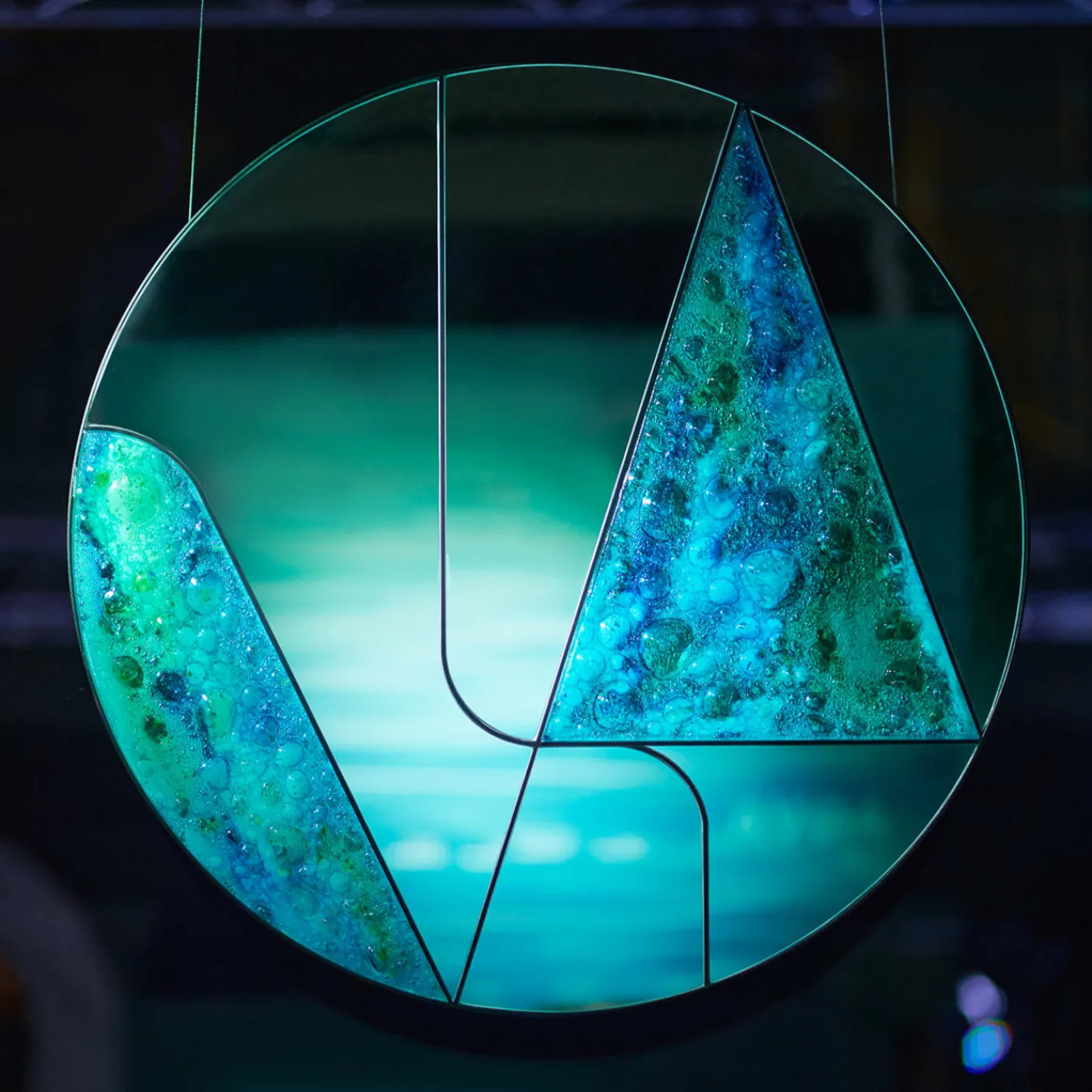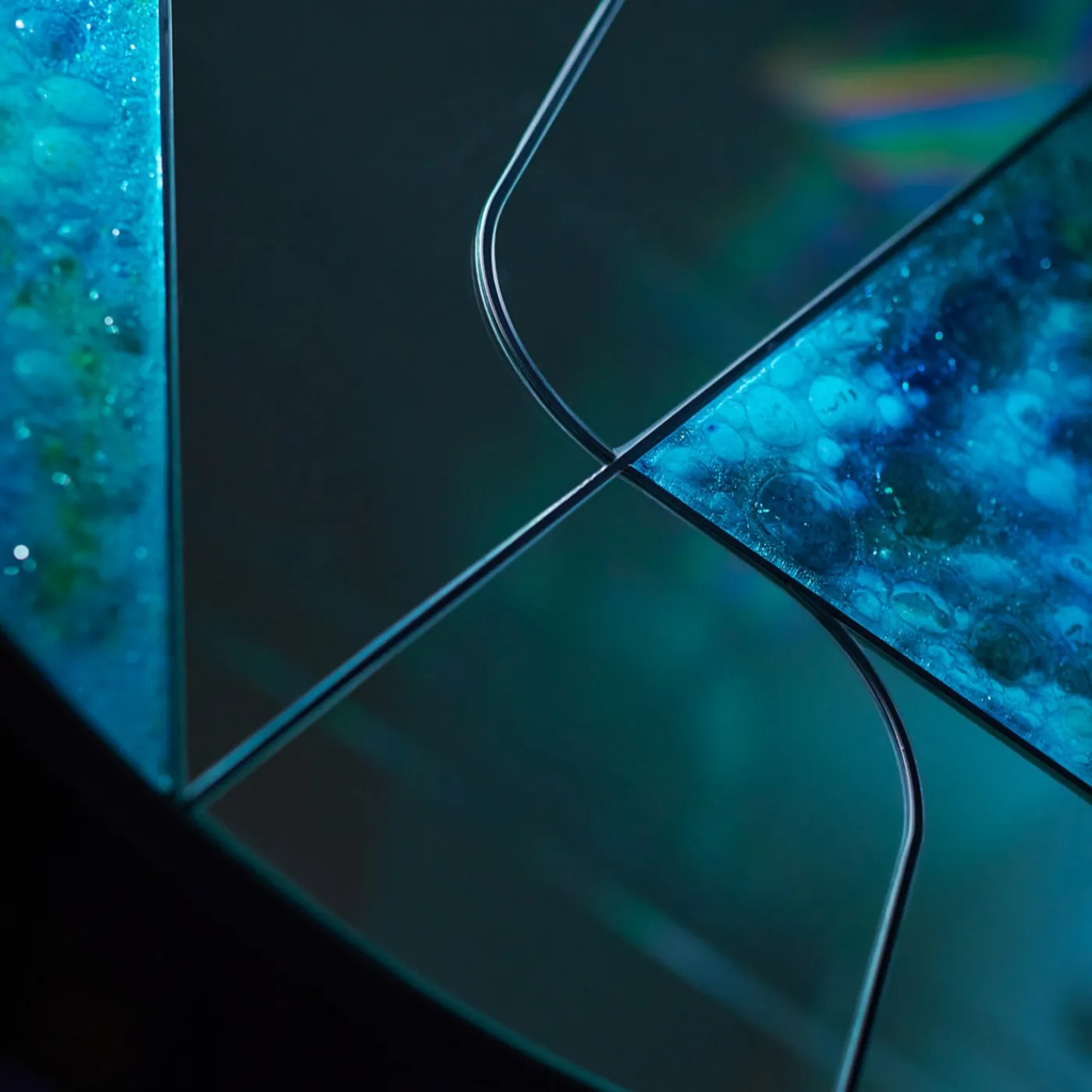 Questo ipnotico specchio rotondo trascende la mera funzione per esaltare la sua intrinseca qualità artistica, ottenuta incorporando nel corpo in vetro specchiato inserti di vetro blu, i primi a ricordare le bolle dell’acqua e i secondi a evocare la limpidezza delle sorgenti. Legno e acciaio completano la struttura di questo pezzo unico che è un ibrido tra uno specchio e un vero e proprio oggetto d’arte.