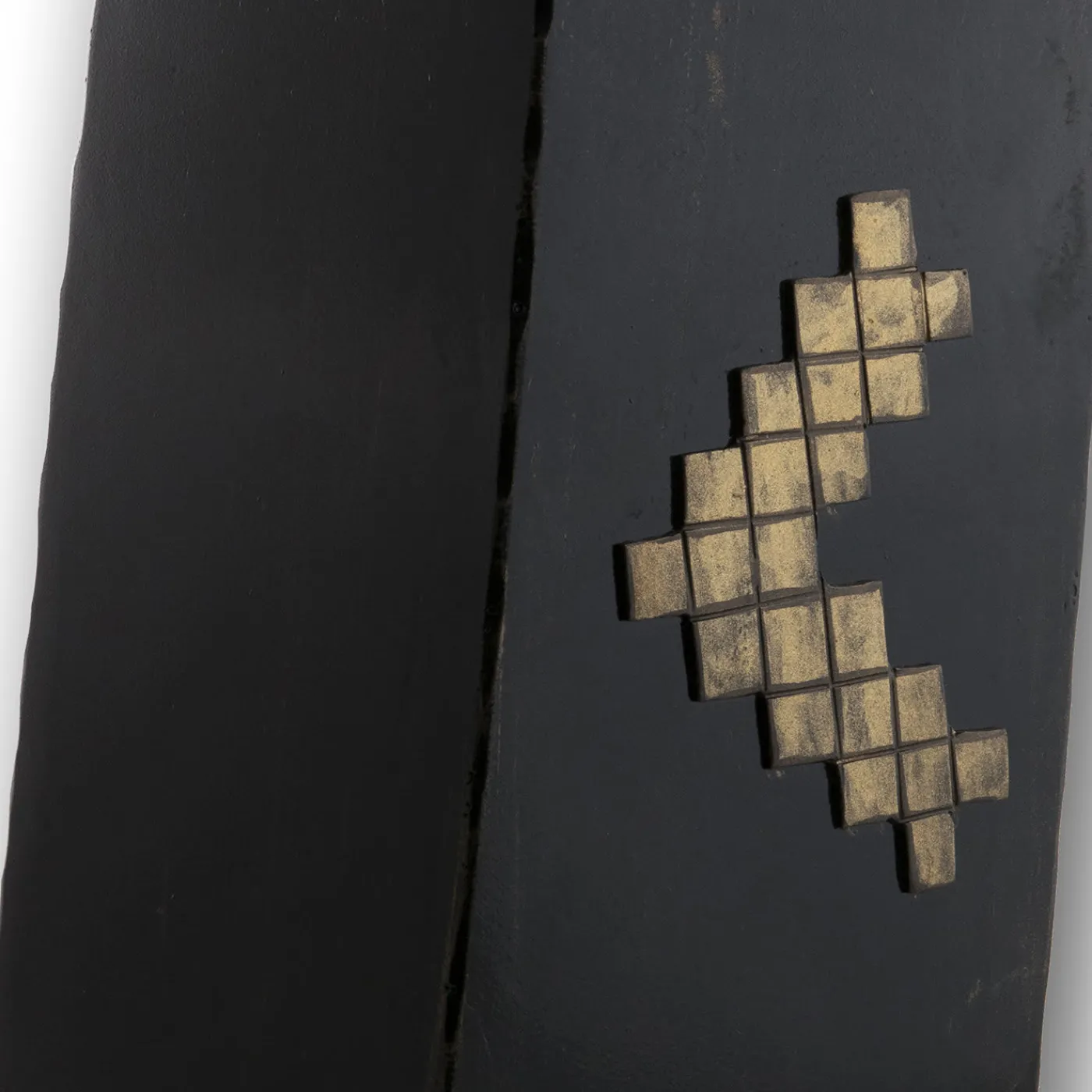 Artigianato d’eccellenza e motivi tradizionali si fondono in questo seducente vaso in acciaio forgiato e inciso a mano, il cui taglio sbieco ne esalta il fascino dinamico e scultoreo. Una punta di freccia dorata e lucida, composta da piccoli quadrati, spicca sul fondo nero brunito. Ispirato all’arte tessile tradizionale della città sarda di Sarule, questo motivo chiamato S’Essere (“l’essere”) simboleggia ordine, armonia e perfezione ed è legato al corpo umano e alla sua capacità di percepire forme e colori. Le piccole variazioni sono il segno di un processo artigianale che rende ogni pezzo unico.