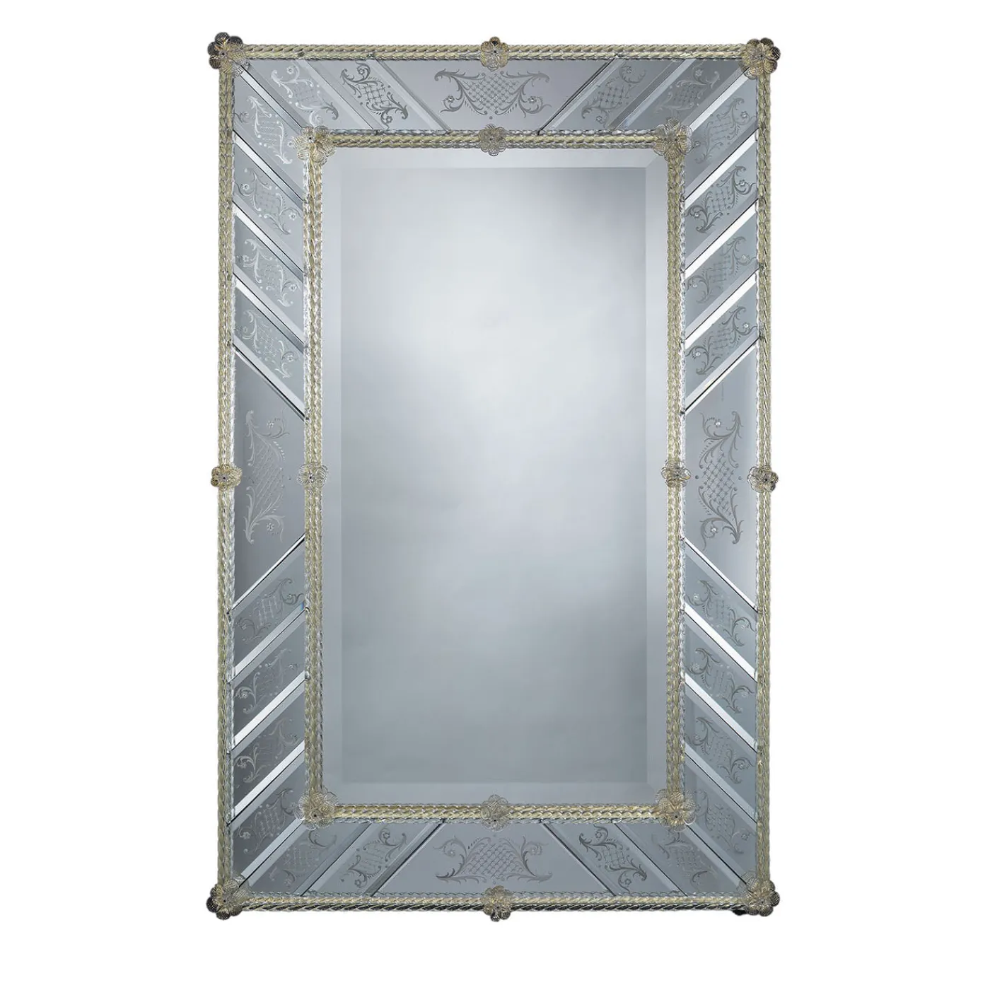 Specchio da parete elegante con una cornice composta da segmenti di vetro specchiato smerigliato ed inciso, realizzati a mano, che creano un gioco dinamico di riflessi. La cornice è arricchita con barre di cristallo torchon su uno sfondo dorato caldo, intrecciate con delicati fiori di vetro e dettagli in foglia d’oro 24k, risultando in una fusione armoniosa di forme e materiali lussuosi. Realizzato con meticolosa attenzione ai dettagli, questo pezzo eleva qualsiasi spazio muro con raffinata sofisticazione.