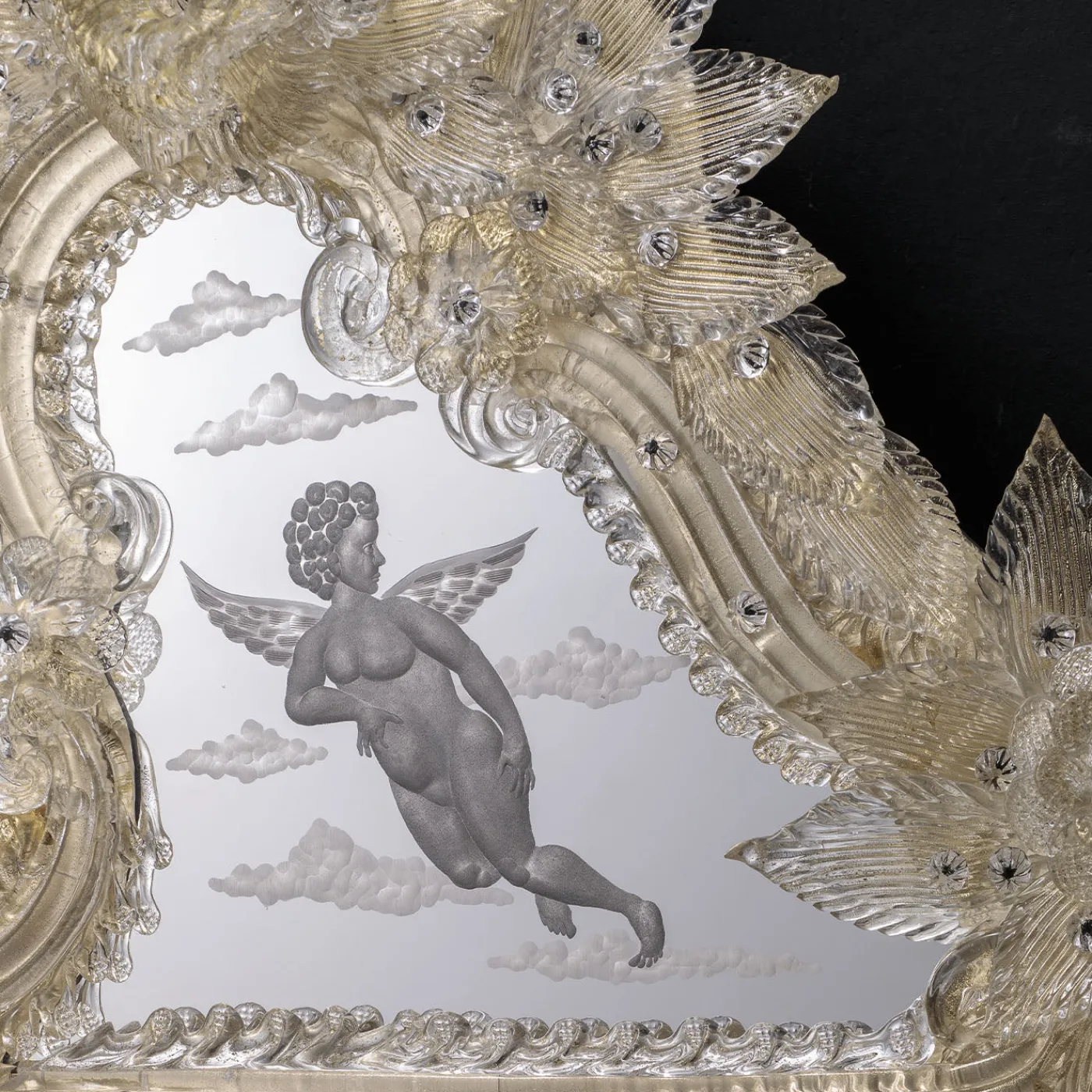 Rex cattura l’opulenza della Venezia del XVII e XVIII secolo attraverso intricati dettagli incisi a mano e argentatura artigianale. Arricchito con delicati elementi in vetro di Murano, tra cui fiori, foglie, canne e riccioli adornati con foglia d’oro 24kt, ogni pezzo di vetro è accuratamente realizzato per evocare un’eleganza storica. Questo design iconico, parte dell’archivio Barbini, è stato presentato in mostre e collezioni curate, riflettendo una ricca eredità culturale e maestria artistica.