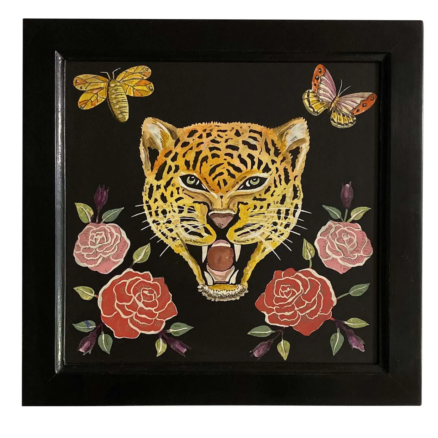 Una cornice in legno nero circonda un sofisticato inserto in ardesia decorato a mano con scagliola per creare un disegno straordinario di una testa di leopardo circondata da insetti e fiori. Completato da una finitura a cera satinata, questo pezzo unico e interamente realizzato a mano misura 24 x 24 cm, con una piastrella interna di 20 x 20 cm.