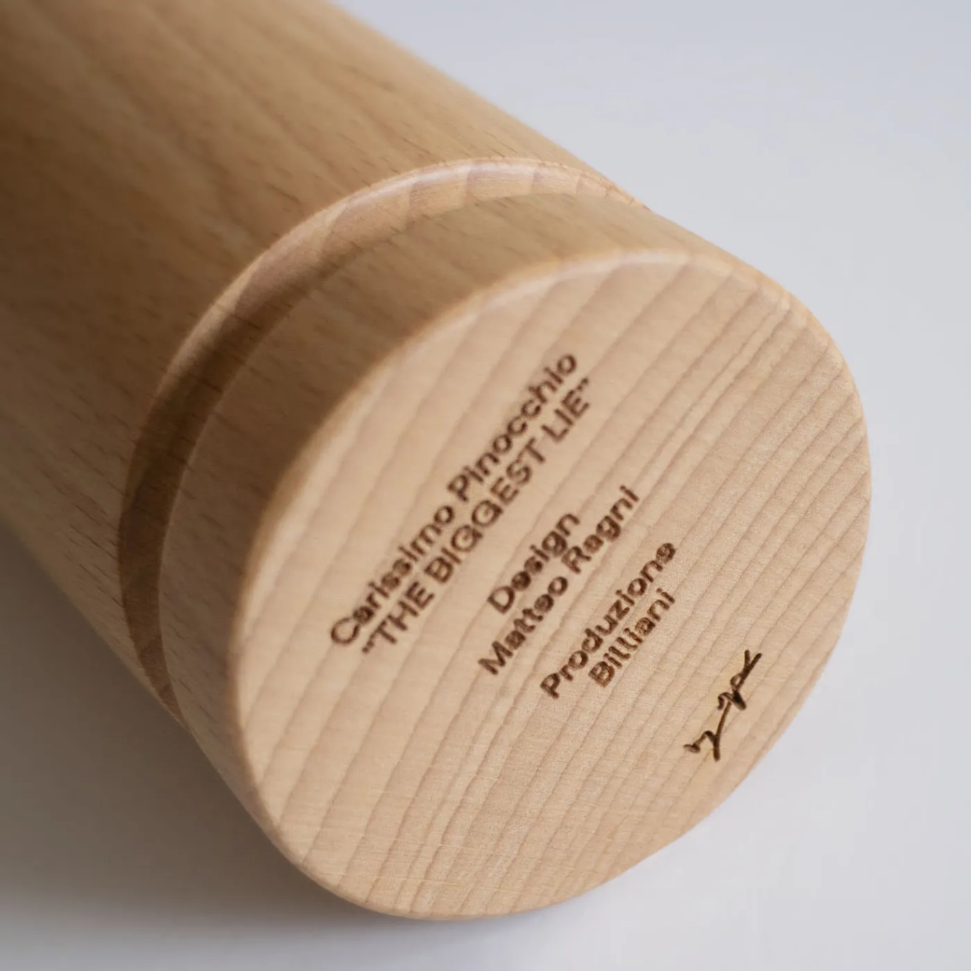 Una rappresentazione scultorea che distilla l’iconica figura in forme geometriche elementari: un cilindro, una sfera e un cappello conico completati da un naso esagerato e sottile. Questo design enfatizza l’immediata riconoscibilità visiva e si pone come simbolo del patrimonio del design italiano accanto a classici come la lampada Tizio e la Fiat Panda. “La più grande bugia” è stata presentata all’ADI Design Museum di Milano tra novembre 2023 e febbraio 2024 in occasione della mostra “Caro Pinocchio, designer e grafici italiani ridisegnano il burattino più famoso del mondo”, curata da Giulio Iacchetti.