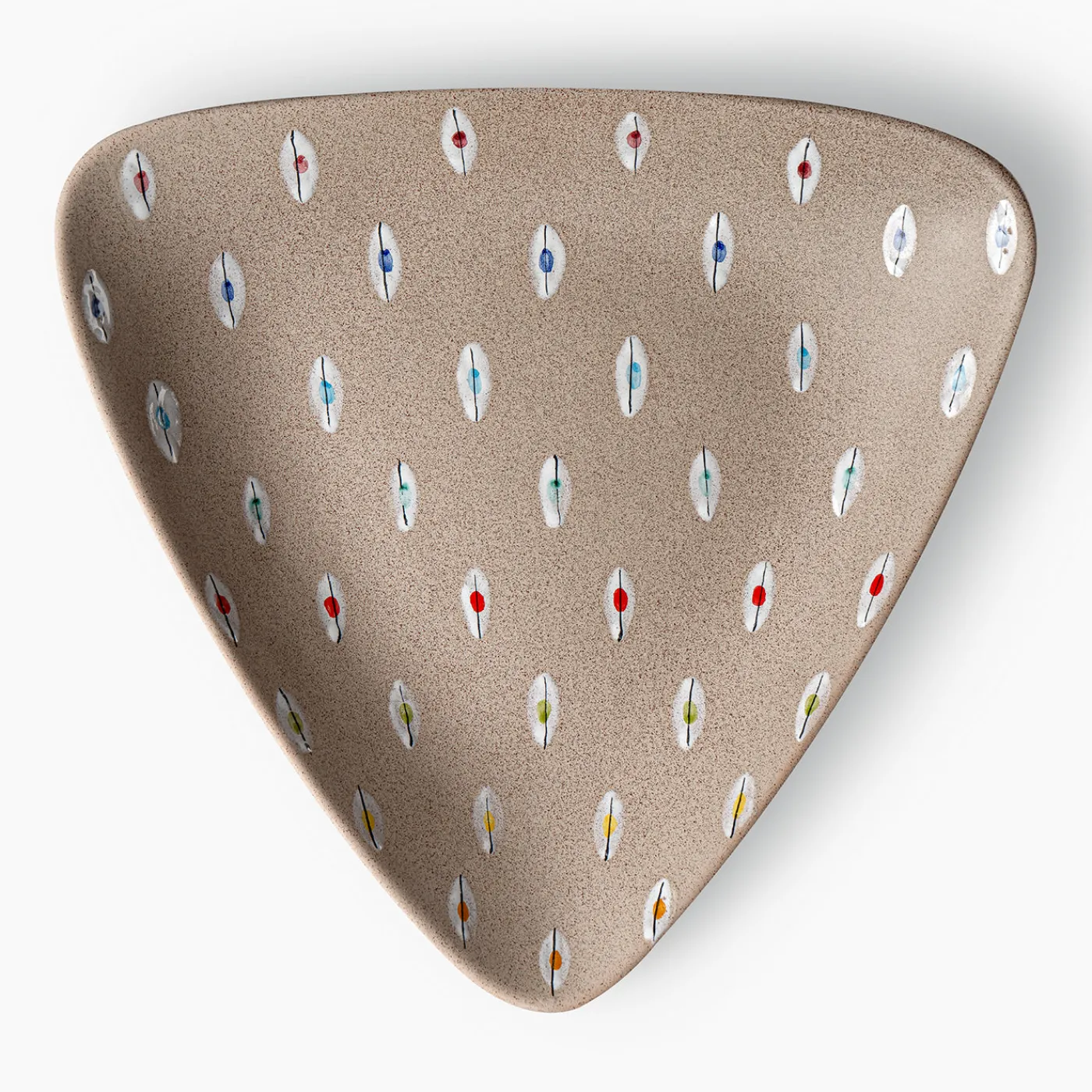 Questo centrotavola triangolare presenta una forma in terracotta pressata con una base grigia finemente screziata. La superficie è decorata con una serie di piccoli motivi dipinti a pennello in bianco, accentuati da colori vari, che ricordano piume multicolori o occhi di pernice. Parte della riedizione in edizione limitata del 2006 dall’archivio storico, è disponibile in soli 199 esemplari.