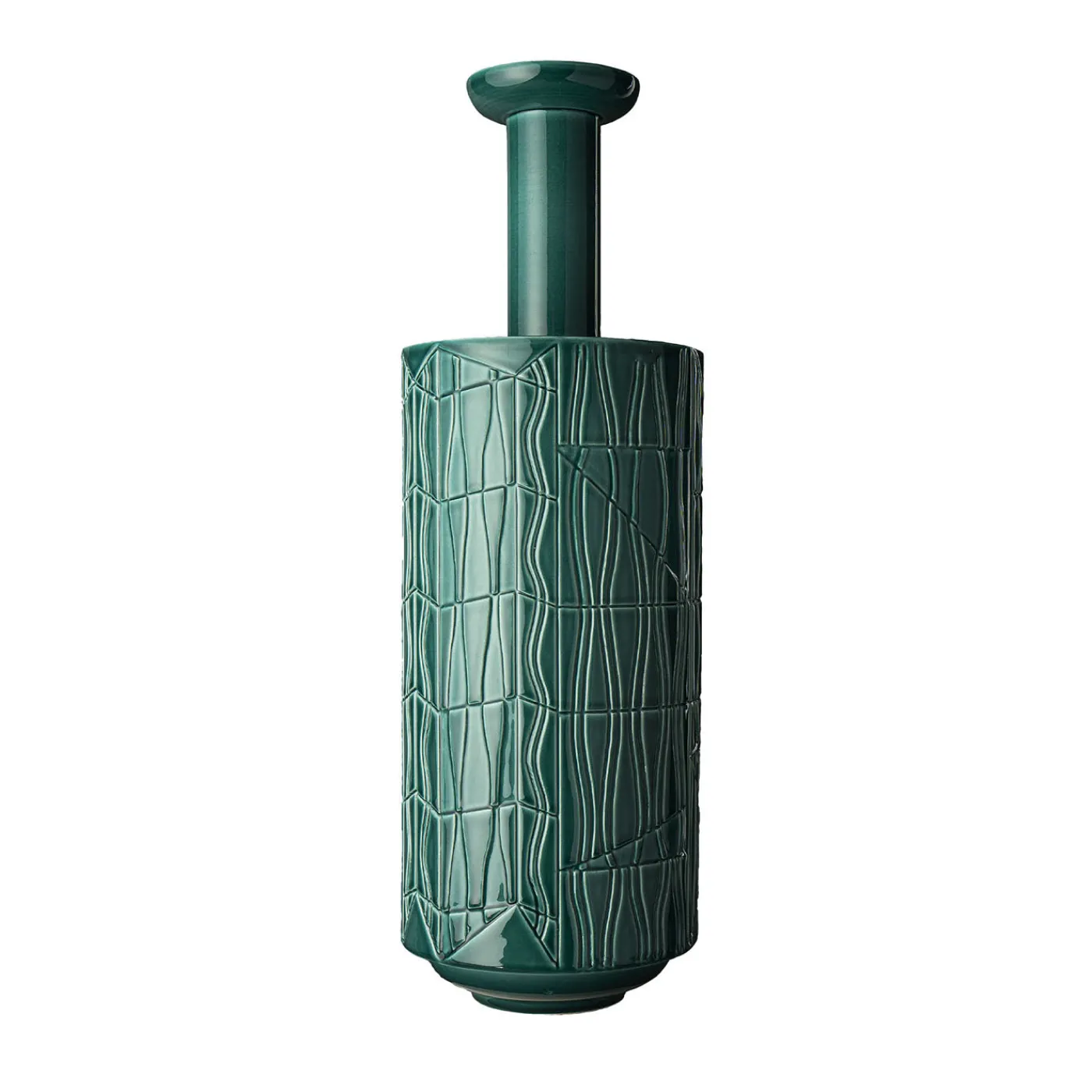 Questo sorprendente vaso è stato disegnato da Bethan Laura Wood nel 2016. Il suo corpo in argilla bianca ha una forma cilindrica con una piccola base e una parte superiore allungata. La finitura verde vivo presenta intagli geometrici, mentre la parte superiore è lasciata liscia.