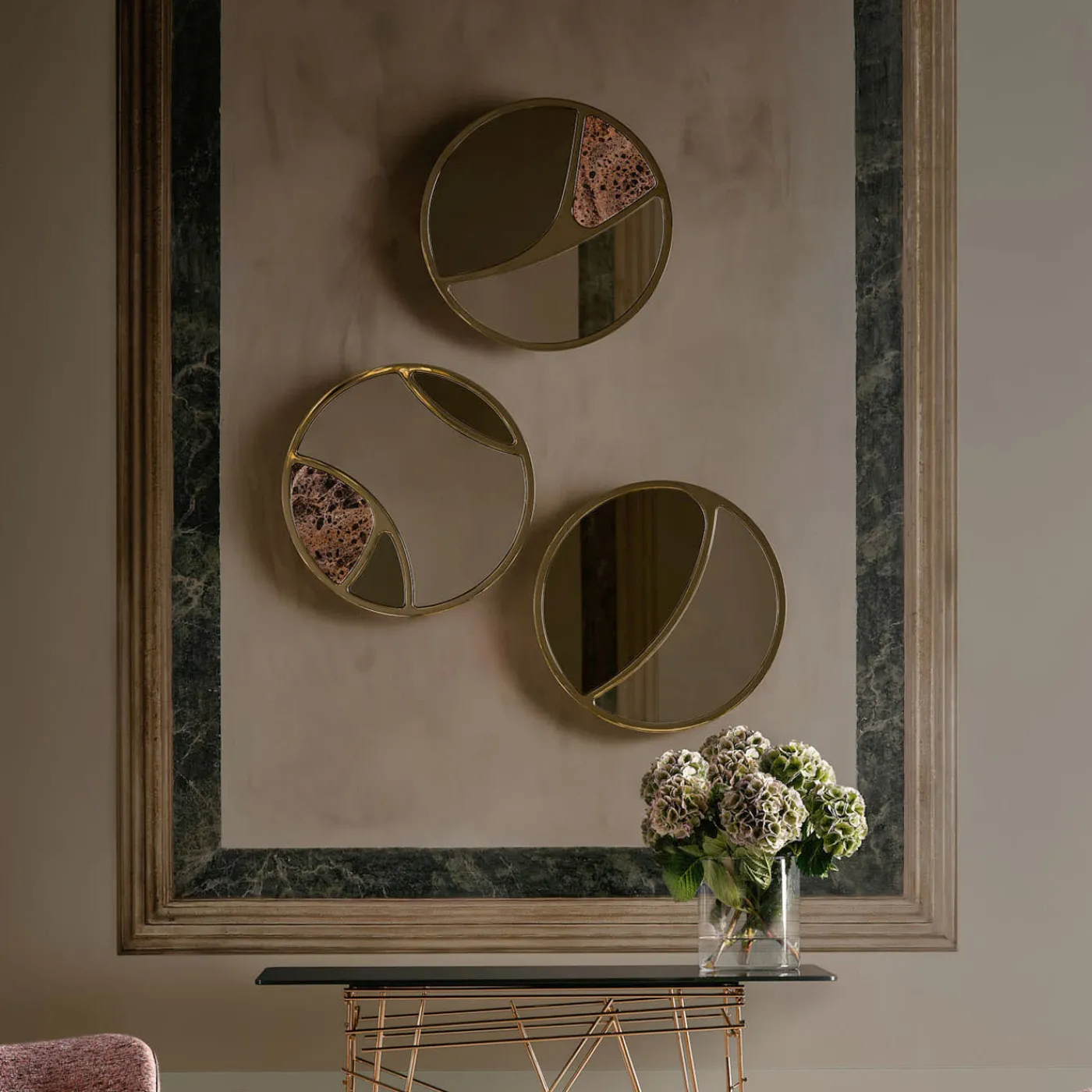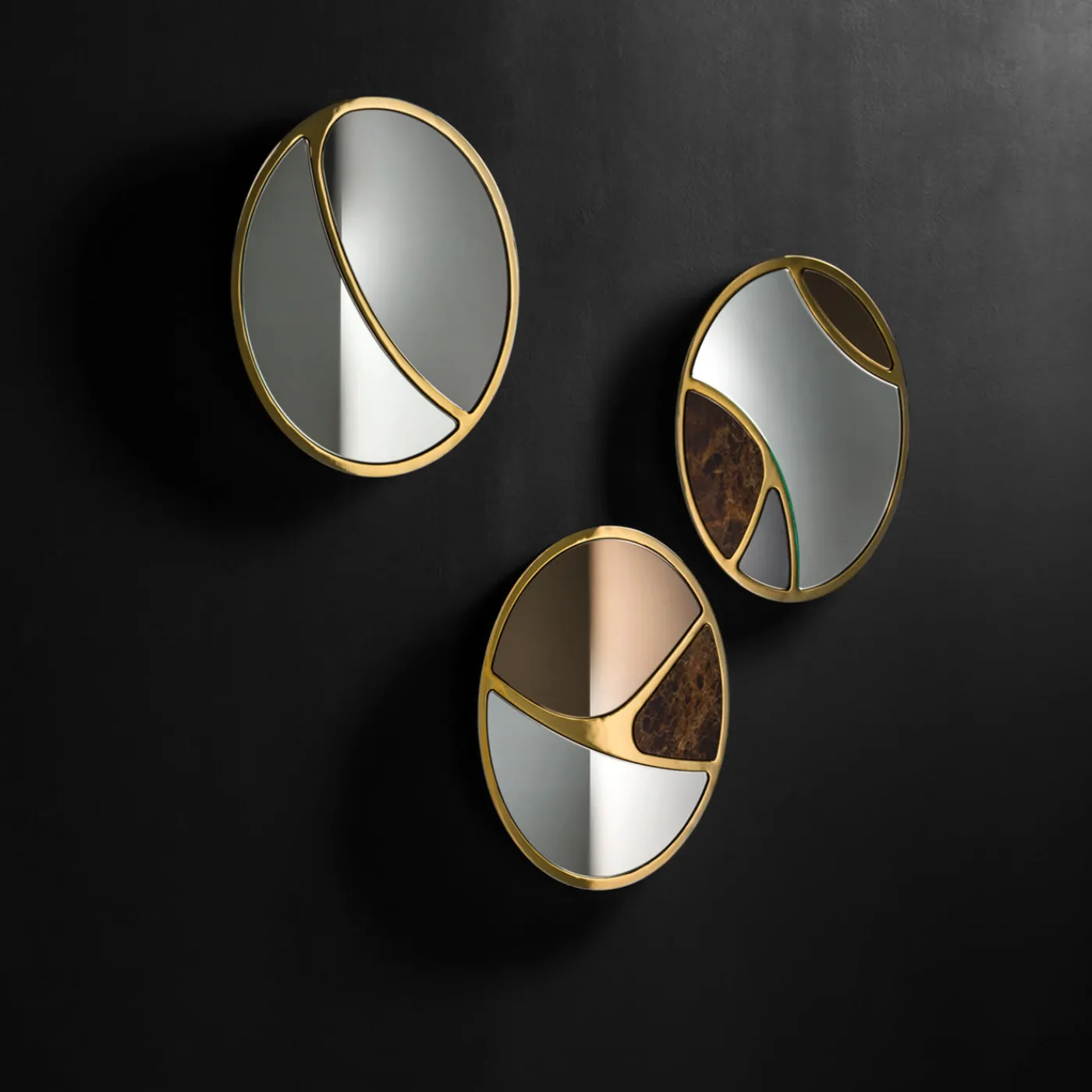 Combinazione di materiali raffinati in un design unico, questo specchio presenta tre sezioni, elegantemente divise da una cornice in metallo tagliato al laser con finitura in bronzo: una in marmo Emperador, una in grigio fumé e la sezione più grande in specchio trasparente. La struttura è realizzata in MDF laccato nero e si monta a parete con una staffa posteriore.