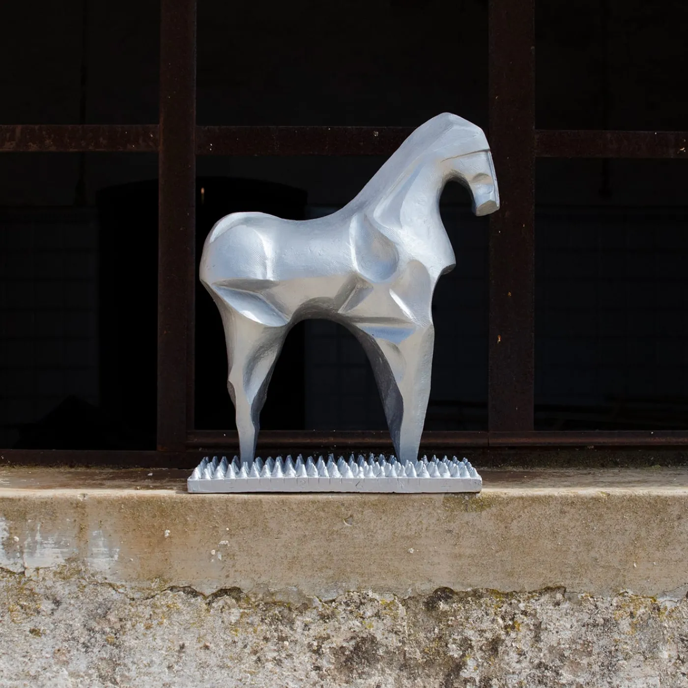 Modello in bronzo ricavato da una scultura in ceramica con alcuni elementi in plastica nel punto di contatto tra la scultura e la base. Questi elementi presentano una texture continua di spine su tutta la superficie. Lo studio dell’opera è legato al simbolo del cavallo di Troia.
