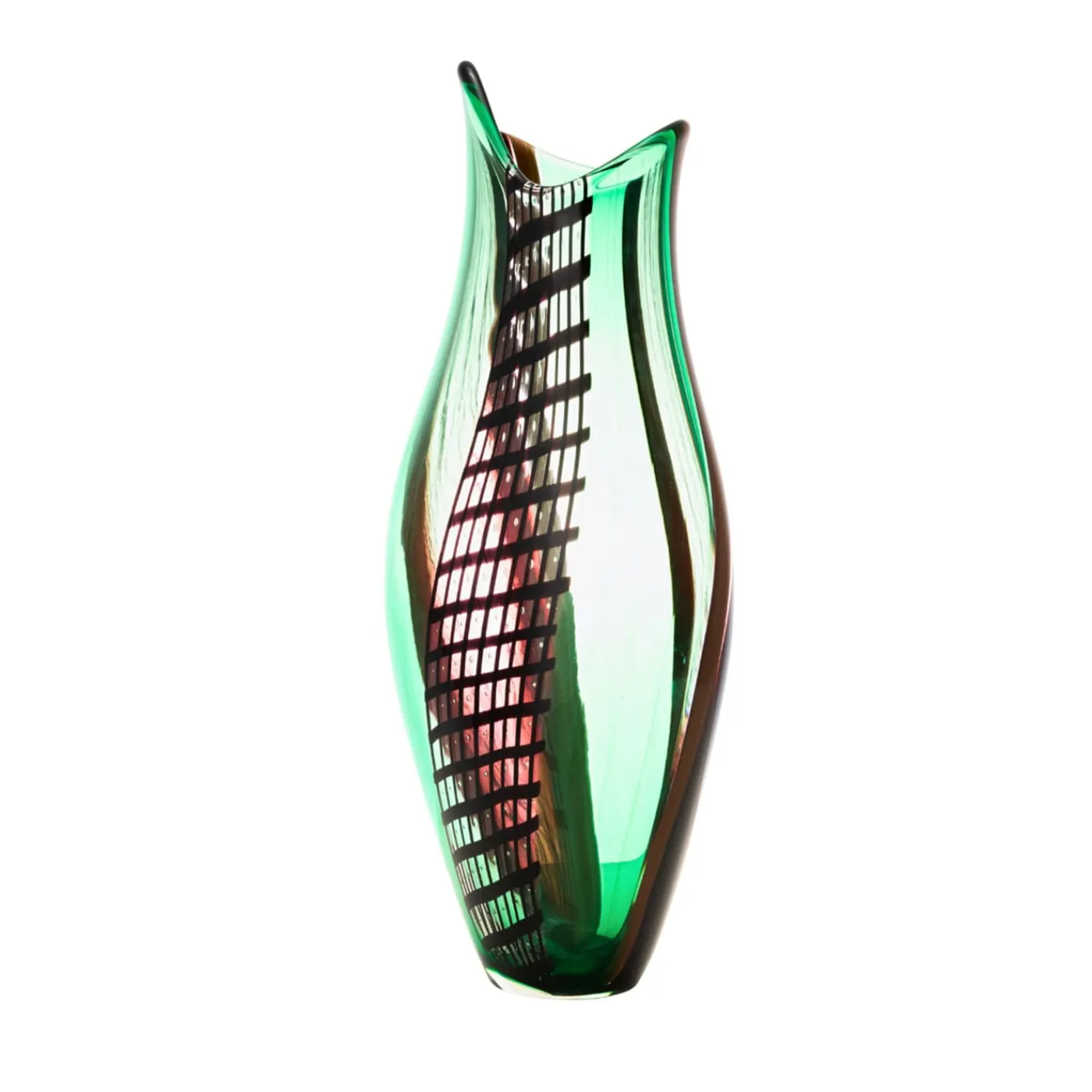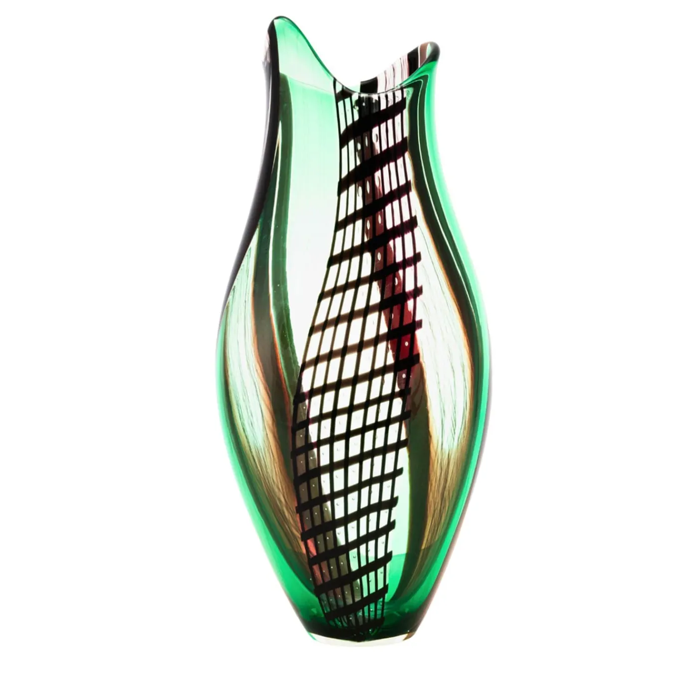 Magistralmente soffiato a bocca da bacchette di vetro policrome, questo superbo vaso di vetro cattura lo sguardo con i suoi intriganti inserti decorativi. Elementi reticolari e a spirale derivanti dalla tecnica “Zanfirico” si fondono con la filigrana, creando stupefacenti interazioni tra linee, tinte e trasparenze. Ogni pezzo è un capolavoro unico, seguito da una garanzia e da un certificato di autenticità.