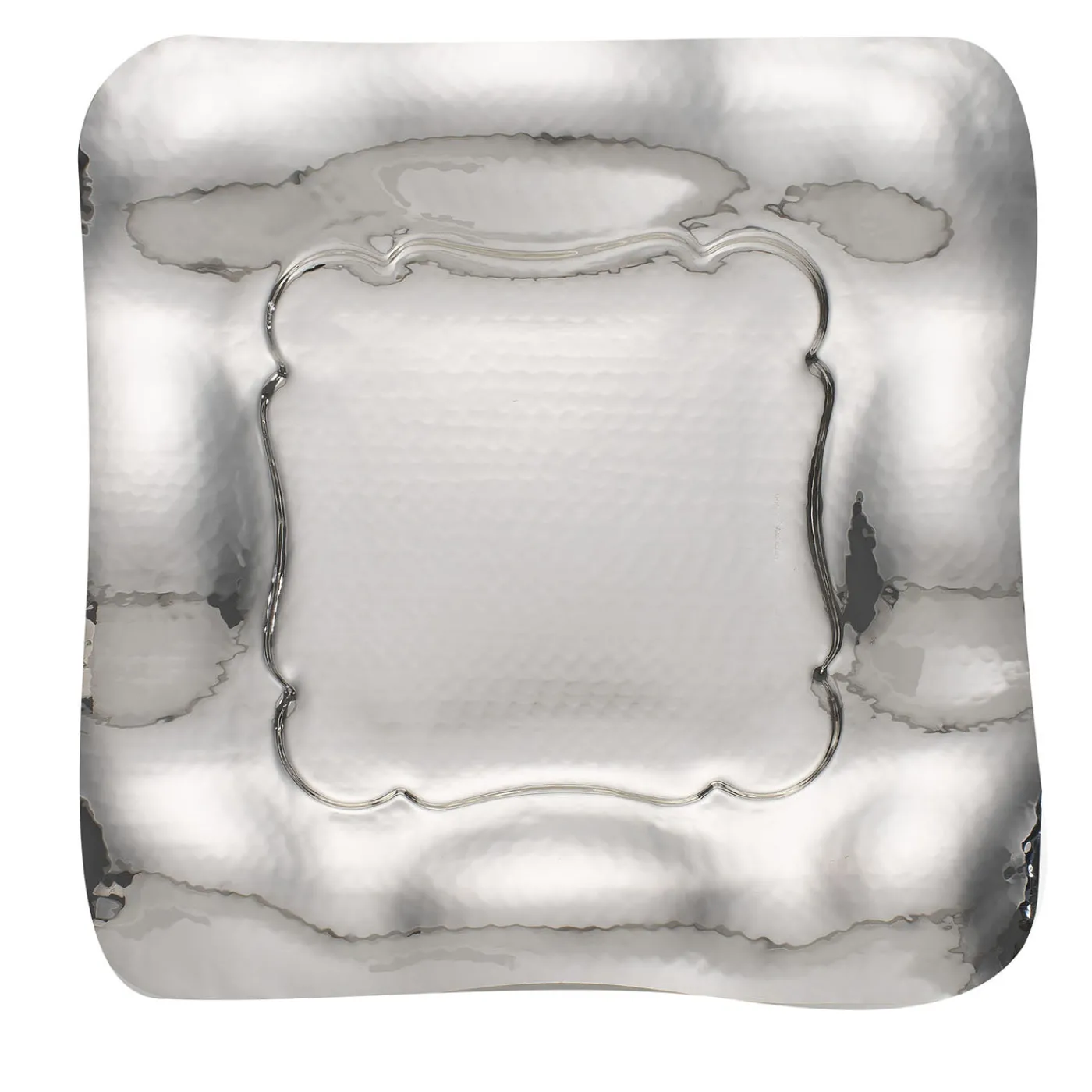 Centrotavola quadrato di medie dimensioni (30×30 cm), caratterizzato da un bordo leggermente rialzato con texture martellata e rifinito con una placcatura argentata che ne esalta l’eleganza. Il design combina linee morbide e una superficie delicatamente lavorata, creando un oggetto decorativo raffinato e funzionale, ideale sia per l’esposizione che per un utilizzo pratico.
