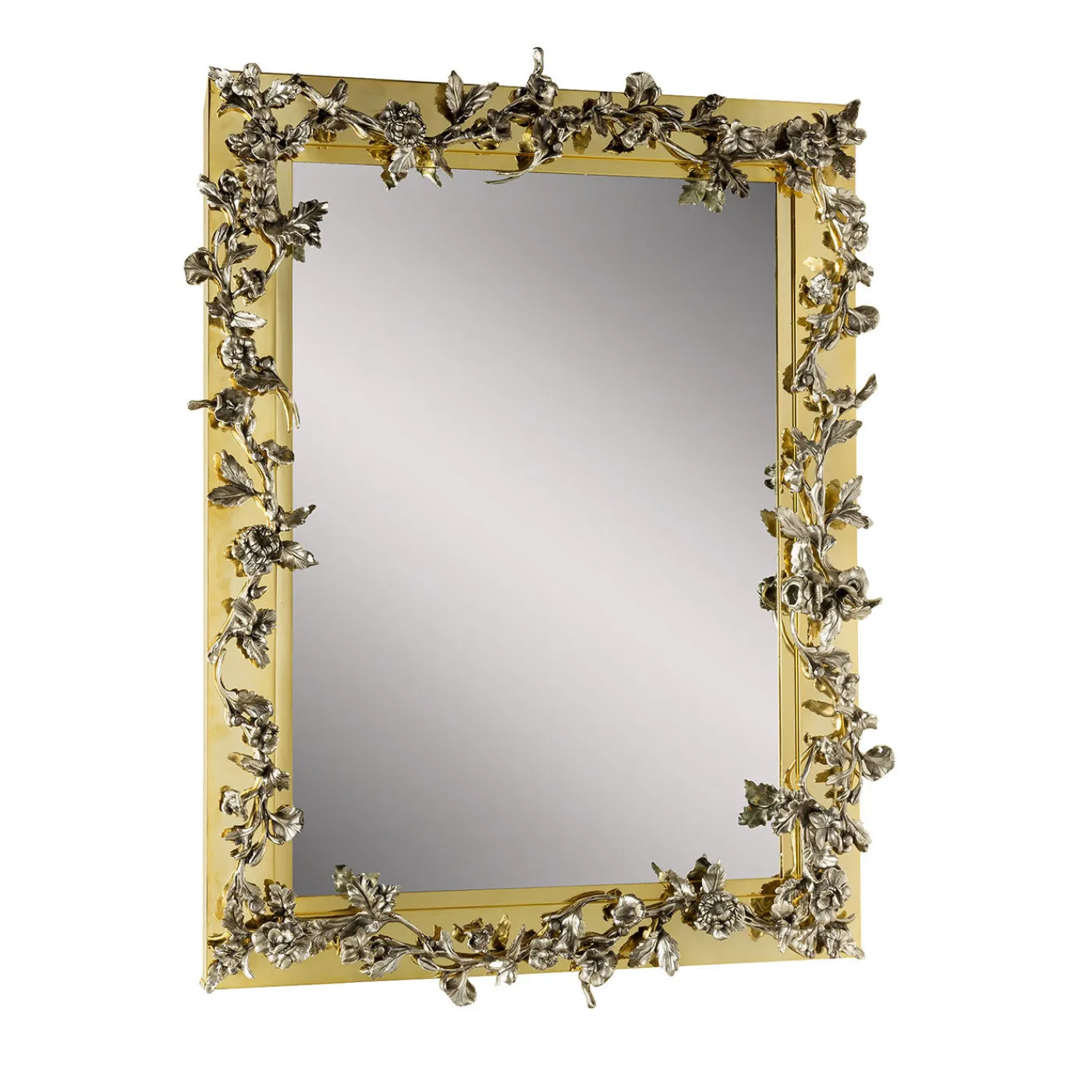 Questo specchio rettangolare della collezione Luxury Foundry presenta una cornice in ottone naturale impreziosita da applicazioni floreali in bronzo finemente lavorato. I dettagli floreali in bronzo creano un contrasto suggestivo con la cornice metallica liscia, fondendo l’artigianato classico con il lusso moderno. La sua dimensione media lo rende un elemento decorativo raffinato, ideale per arricchire l’eleganza di qualsiasi ambiente d’interno.