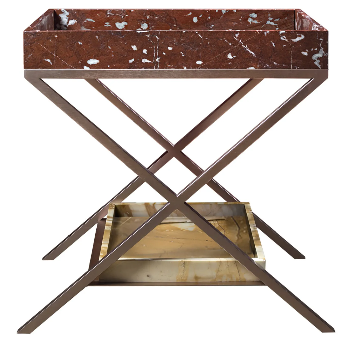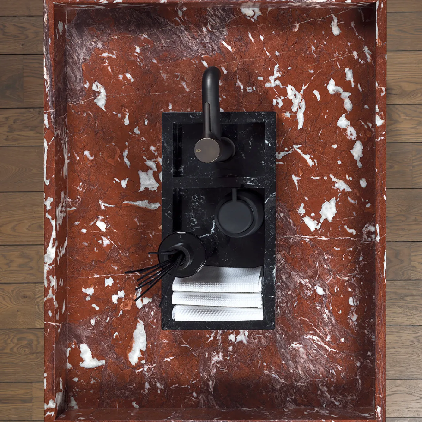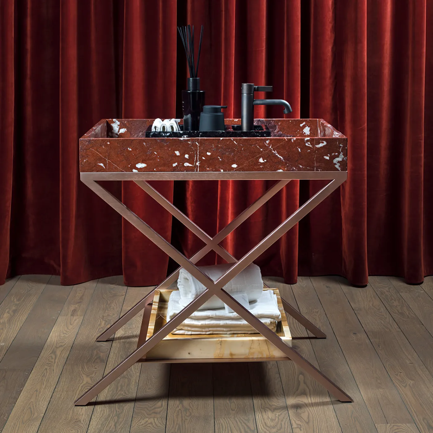 Questo straordinario pezzo di artigianato e design in marmo è un oggetto d’arte unico per qualsiasi bagno elegante contemporaneo o tradizionale. Presenta uno squisito lavabo in marmo Rosso Francia, che ospita tre vassoi interni più piccoli in marmo Nero Marquinia per panni e saponi. Questo splendido lavabo poggia su uno splendido supporto metallico in rame satinato, che ospita un vassoio in marmo Giallo Siena, funzionale ma di grande effetto, per riporre gli asciugamani.