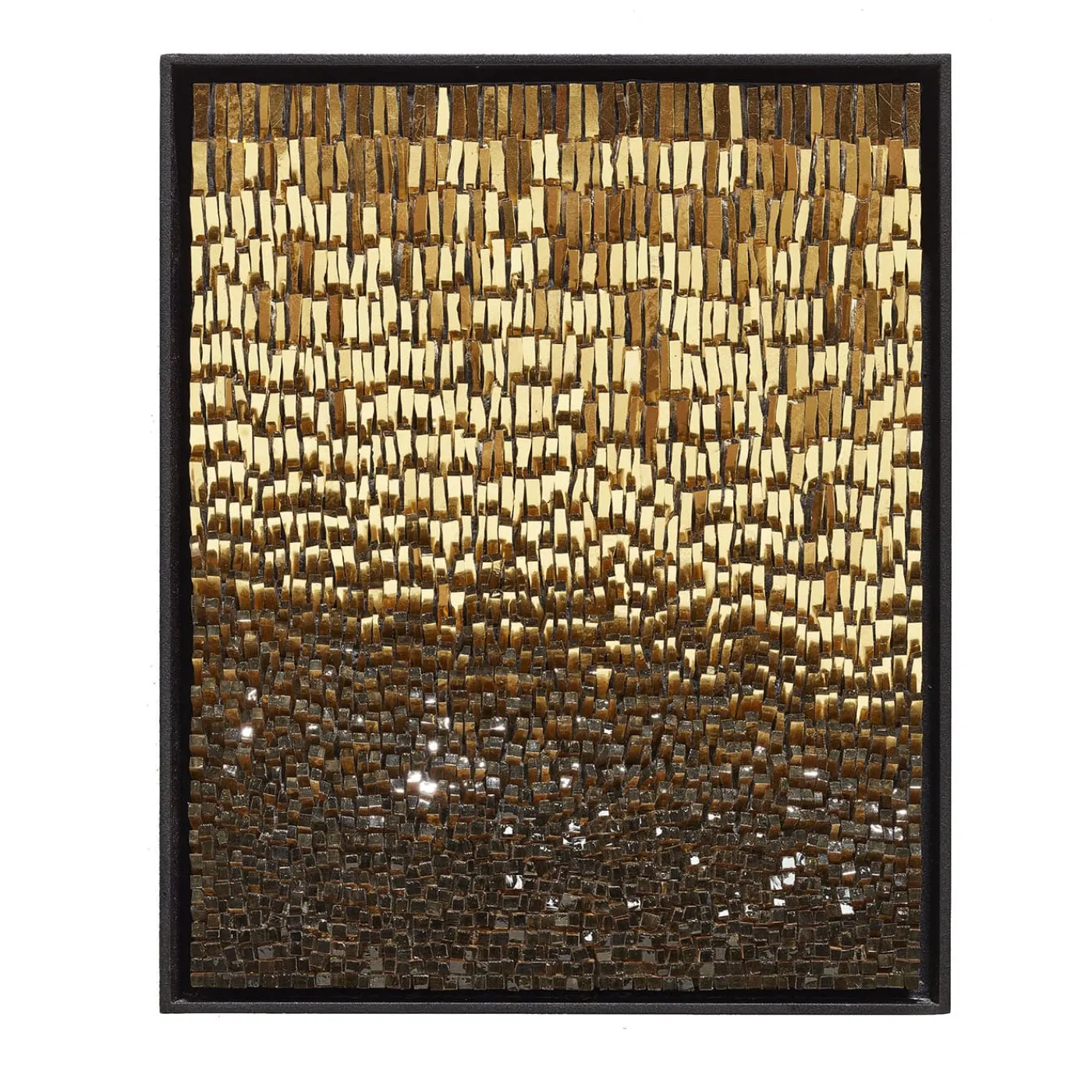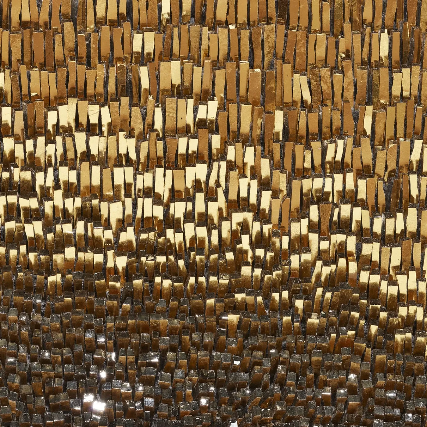 Elegante pezzo decorativo realizzato con pasta di vetro, foglia d’oro, ossidi colorati e malta, meticolosamente incastonato su un pannello di legno multistrato con cornice in ferro. L’effetto sfumato passa da radiose tonalità dorate a sfumature più scure, creando un accattivante gioco di luci e texture. Questo pezzo raffinato aggiunge raffinatezza e profondità a qualsiasi interno, fondendo l’artigianato tradizionale con l’estetica contemporanea.