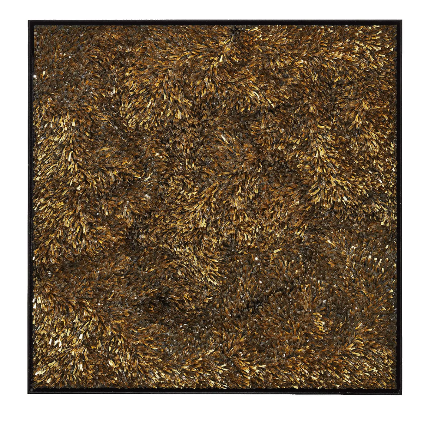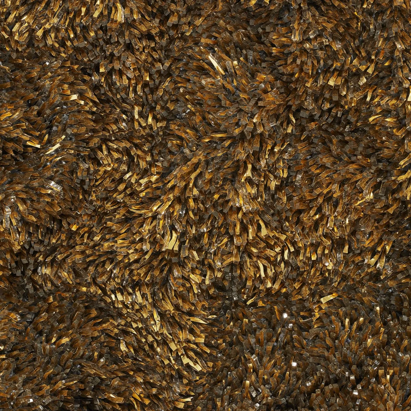 Squisito pezzo decorativo realizzato con pasta di vetro, foglia d’oro, ossidi colorati e malta, posto su una robusta base di legno multistrato incorniciata in ferro. La composizione presenta intricati motivi vorticosi che creano un gioco dinamico di scintillanti tonalità dorate e texture profonde. Un capolavoro di eleganza e raffinatezza, perfetto per valorizzare interni lussuosi con il suo fascino radioso e senza tempo.