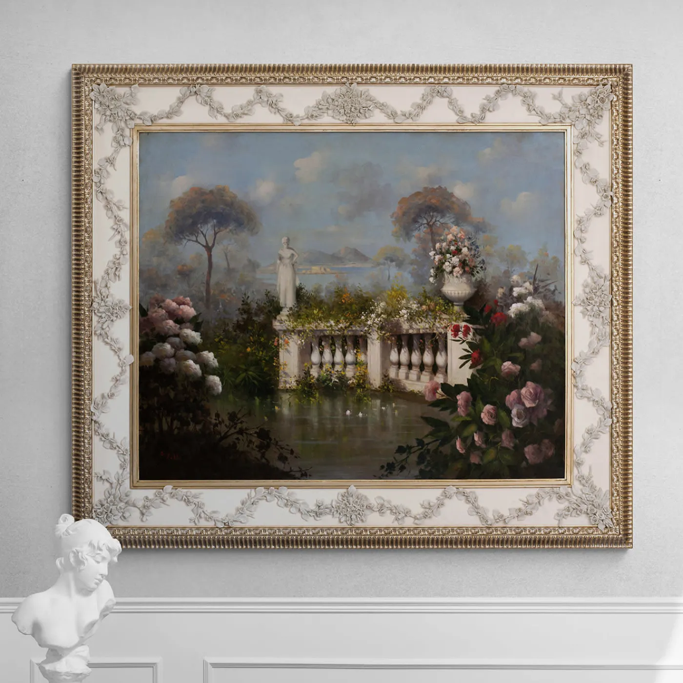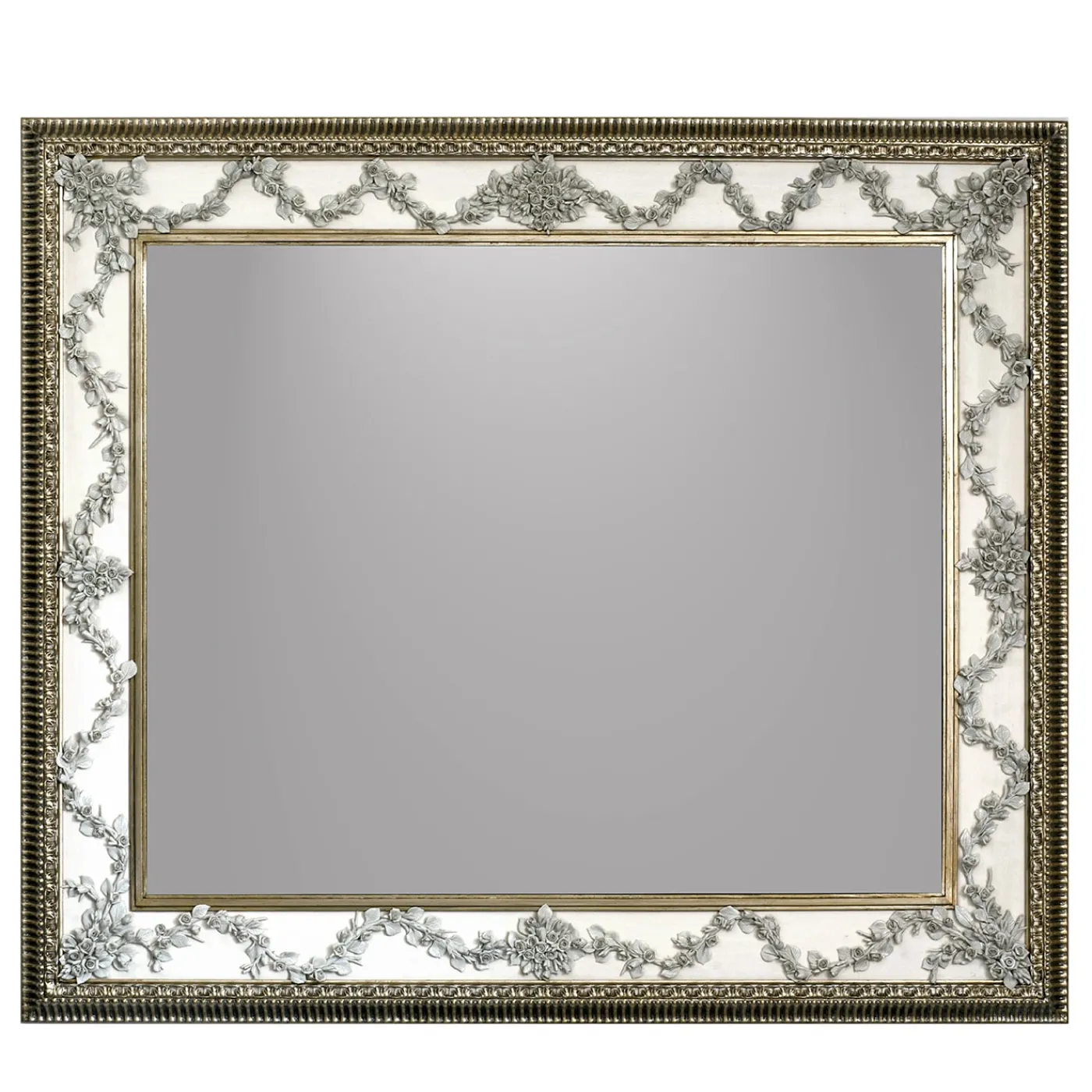 Uno specchio da parete medio‑grande, con una cornice elegante rifinita in vera foglia d’argento, leggermente antichizzata per evocare una calda tonalità dorata. La superficie interna laccata bianca opaca mette in risalto una delicata ghirlanda di rose e boccioli in porcellana, scolpiti con dettagli raffinati e applicati a mano. La decorazione floreale, estremamente delicata, conferisce un tocco romantico: lo specchio è perfetto per interni classici o romantici. Formati e disposizioni personalizzati disponibili su richiesta. Per maggiori informazioni, si prega di contattare il Concierge.
