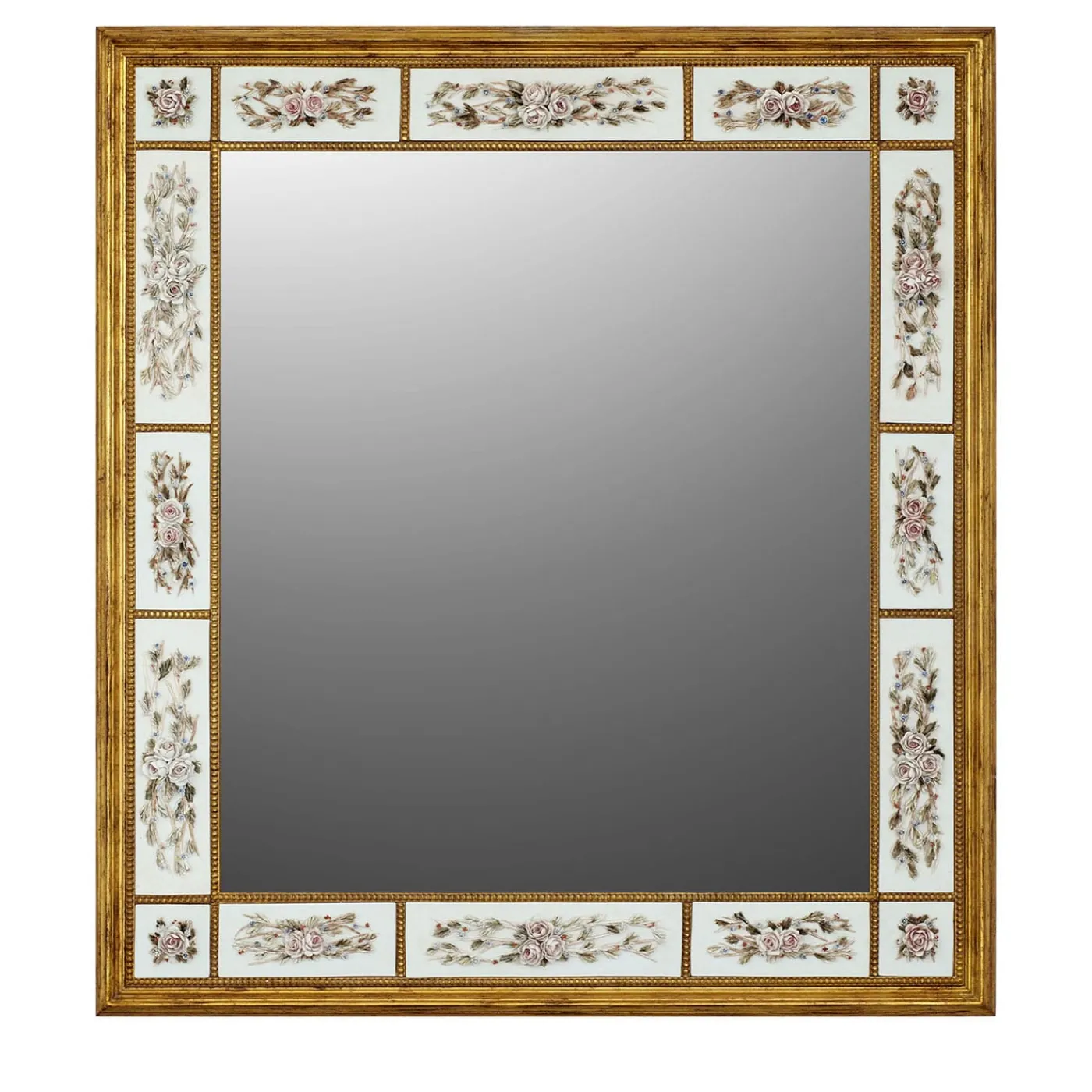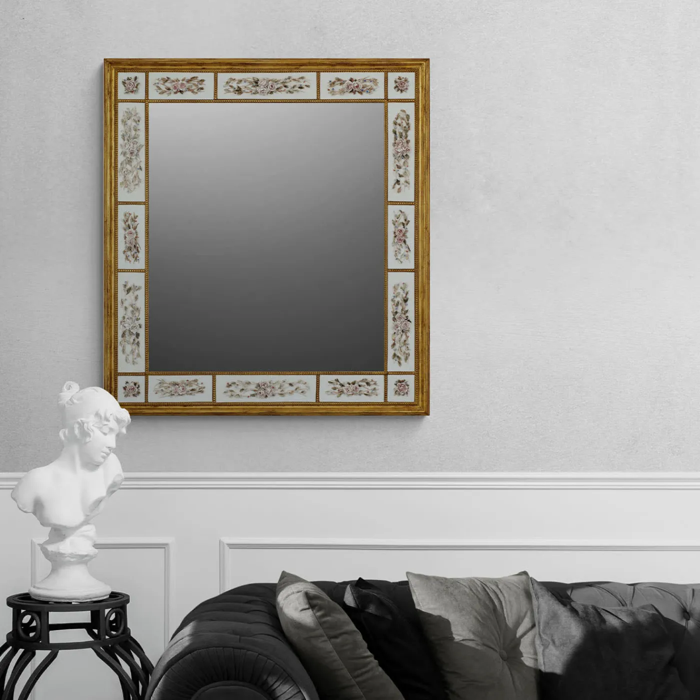Uno specchio da parete finemente dorato, incorniciato da piastrelle in porcellana biscuit di Capodimonte, ciascuna decorata con delicate rose e boccioli dipinti a mano con colori tenui. I motivi floreali sono disposti in sezioni rettangolari attorno allo specchio, combinando eleganza e tradizione artistica. Questo pezzo di medie-grandi dimensioni, radicato nell’arte ceramica napoletana, arricchisce gli interni con un tocco raffinato e romantico.