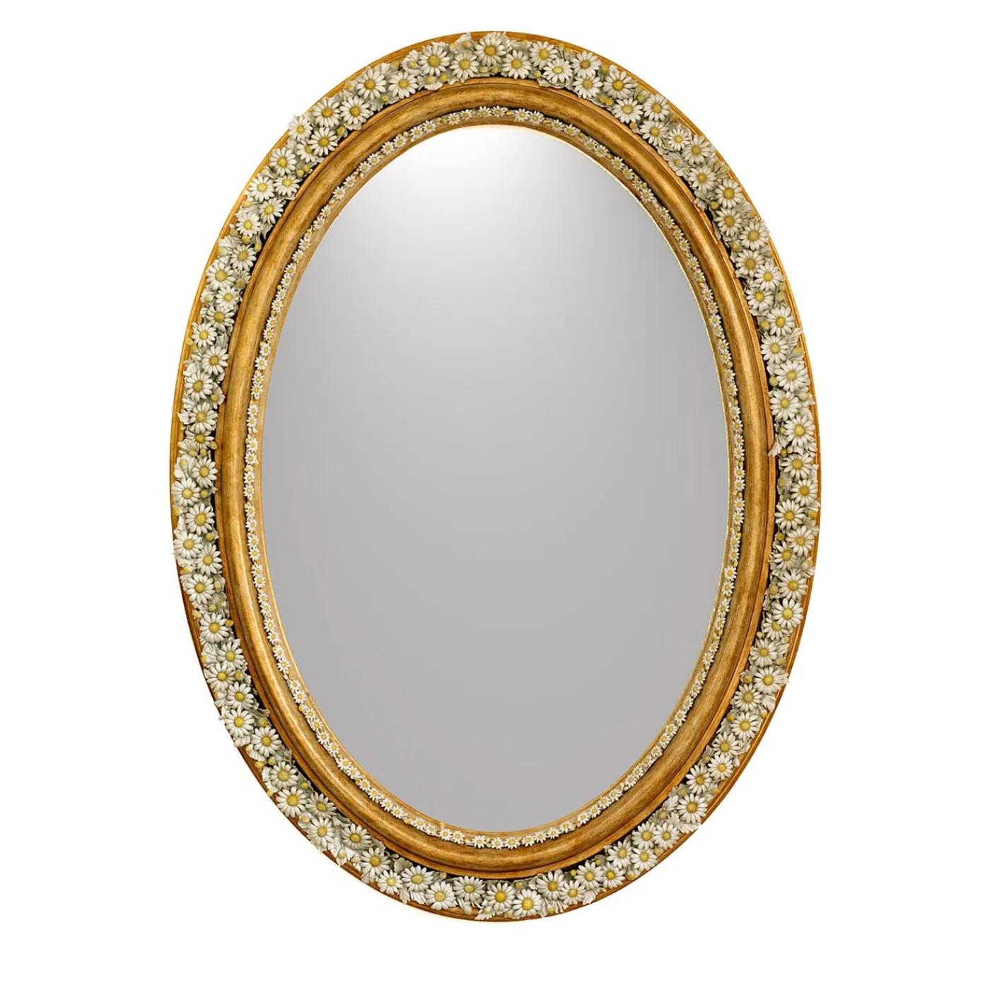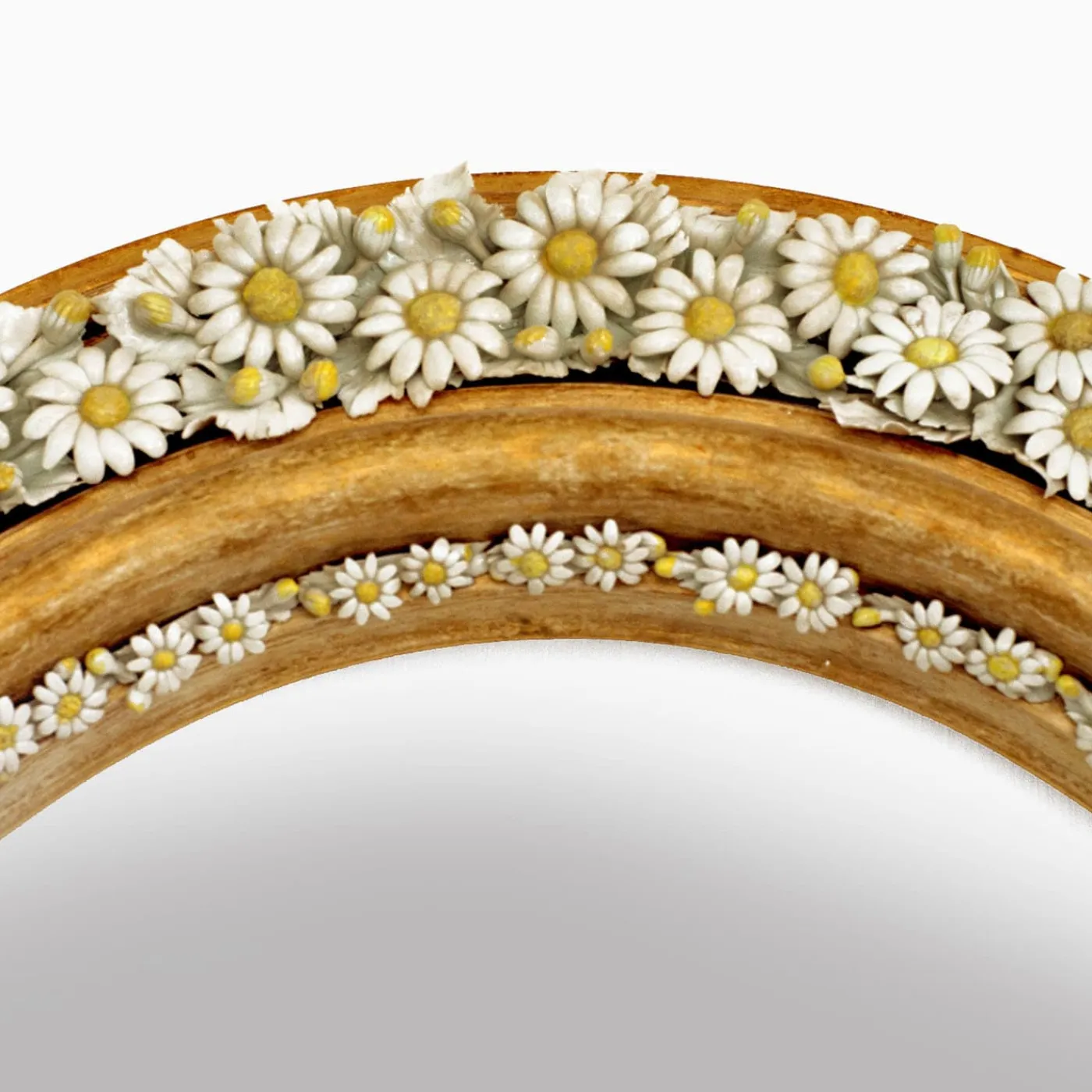 Uno specchio ovale elegante, con cornice impreziosita da margherite in porcellana di Capodimonte finemente modellate e dipinte a mano con colori lucenti a terza cottura. La cornice è interamente rivestita in foglia d’oro e sapientemente brunita a mano, esaltando la notevole maestria della ceramica napoletana. Questo pezzo sprigiona un fascino raffinato ed è ideale per ambienti classici o contemporanei.
