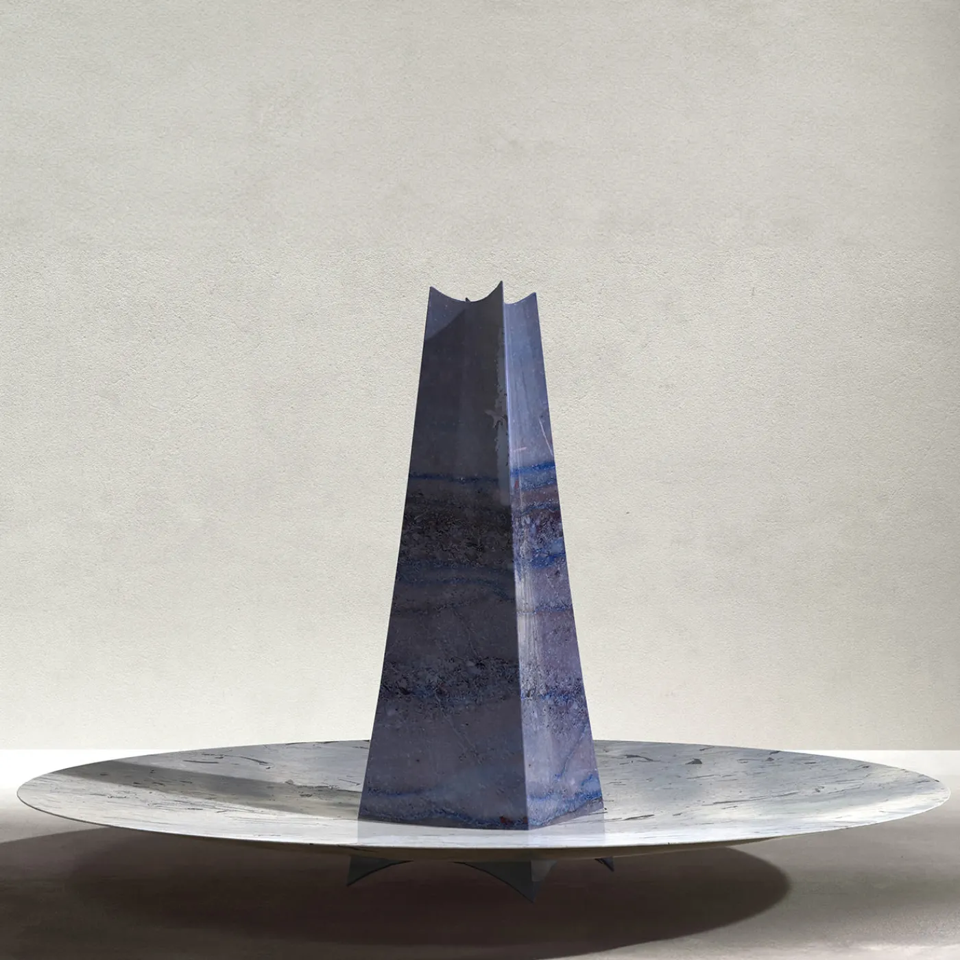 Un piatto di marmo grigio trafitto da un’imponente colonna obelisco in pregiato e raro marmo Azul Macaubas definisce la silhouette scultorea di questo prezioso centrotavola in edizione limitata. Evocativo di antichi capolavori monumentali, sfoggia profili taglienti di straordinario dinamismo che si combinano con una finitura liscia eseguita da maestri artigiani. Ogni pezzo è numerato e personalizzabile su richiesta al Concierge.